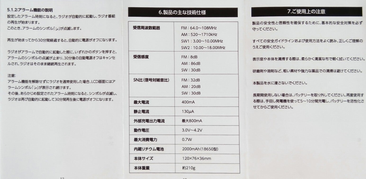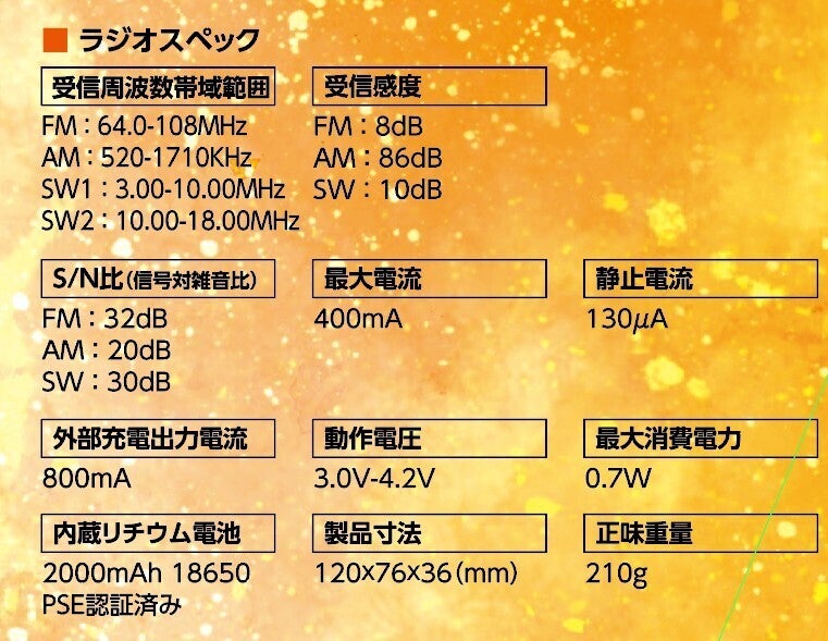※製品サイズ:12X7.6X3.6cm/重量210g※18650リチウム電池式(交換可能)※FM/AM/SWラジオ、USB・ソーラー・手回し充電、スマホ充電、防犯サイレン付き