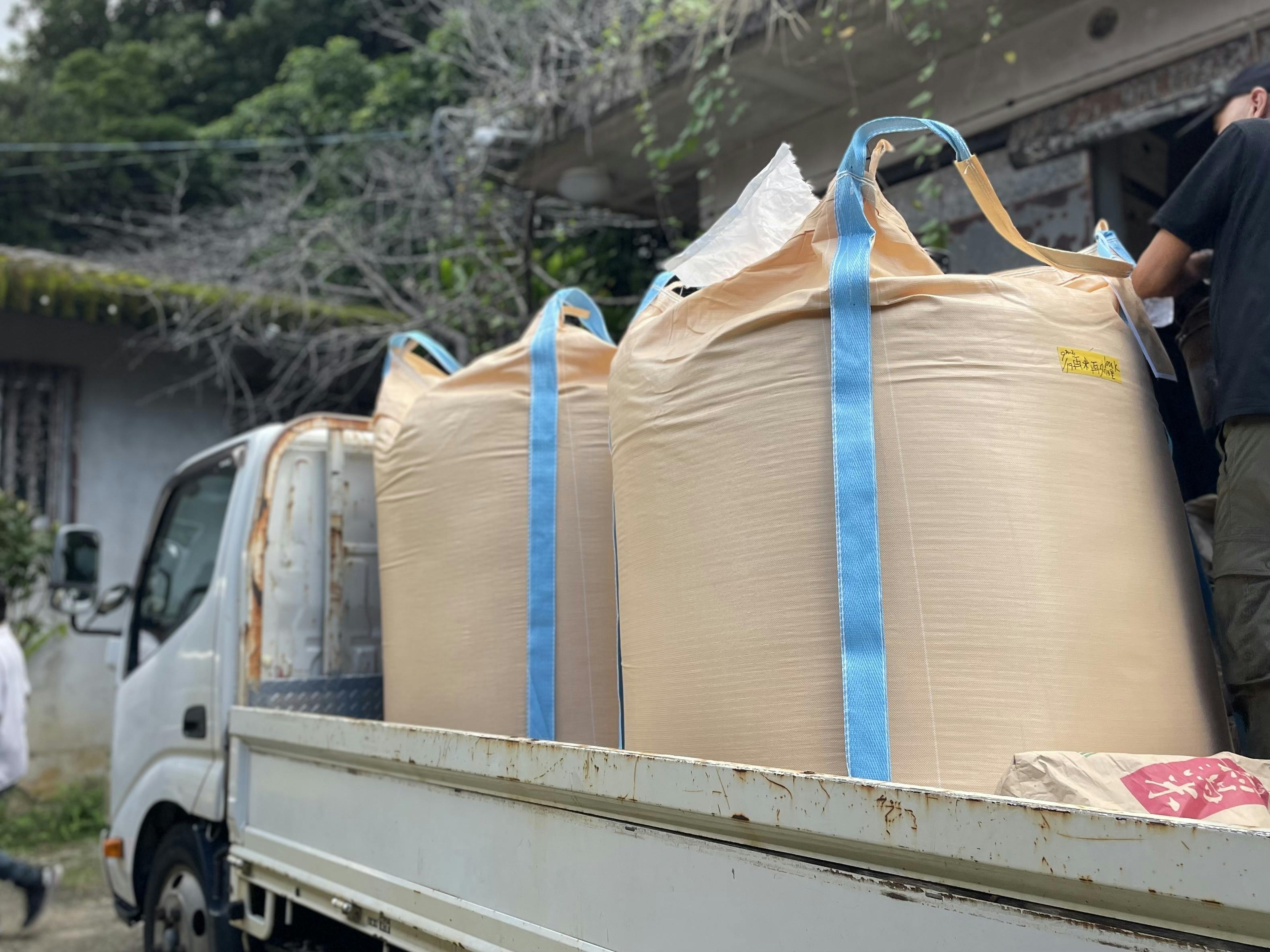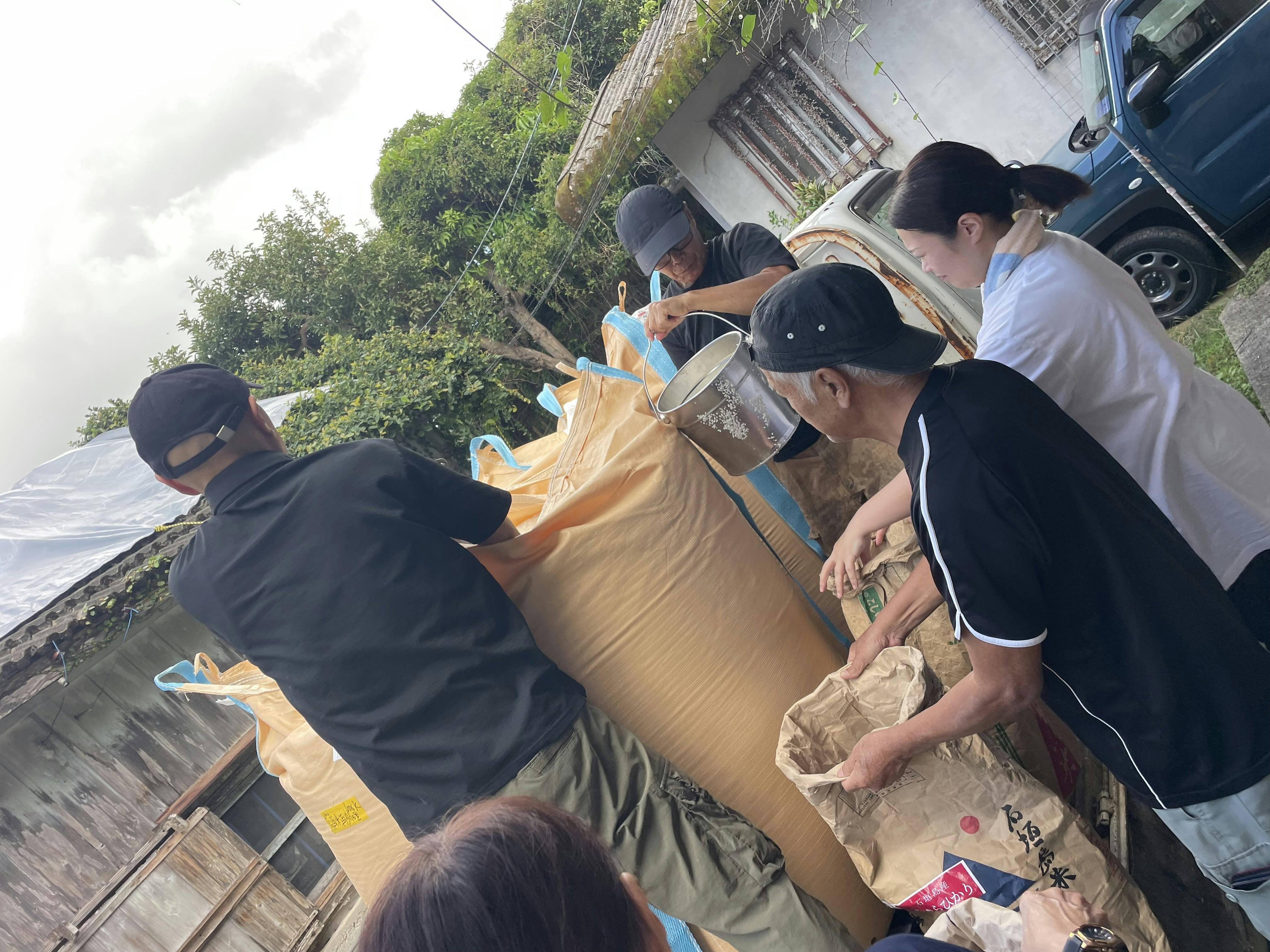 一袋1トン入りのお米を、スタッフみんなで紙袋に小分けして、倉庫に積み上げていきます。