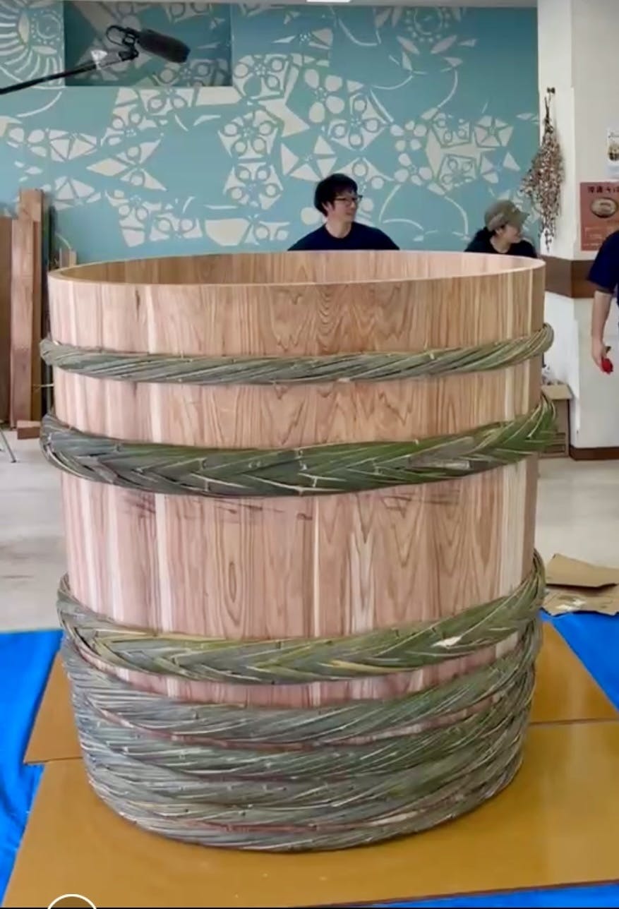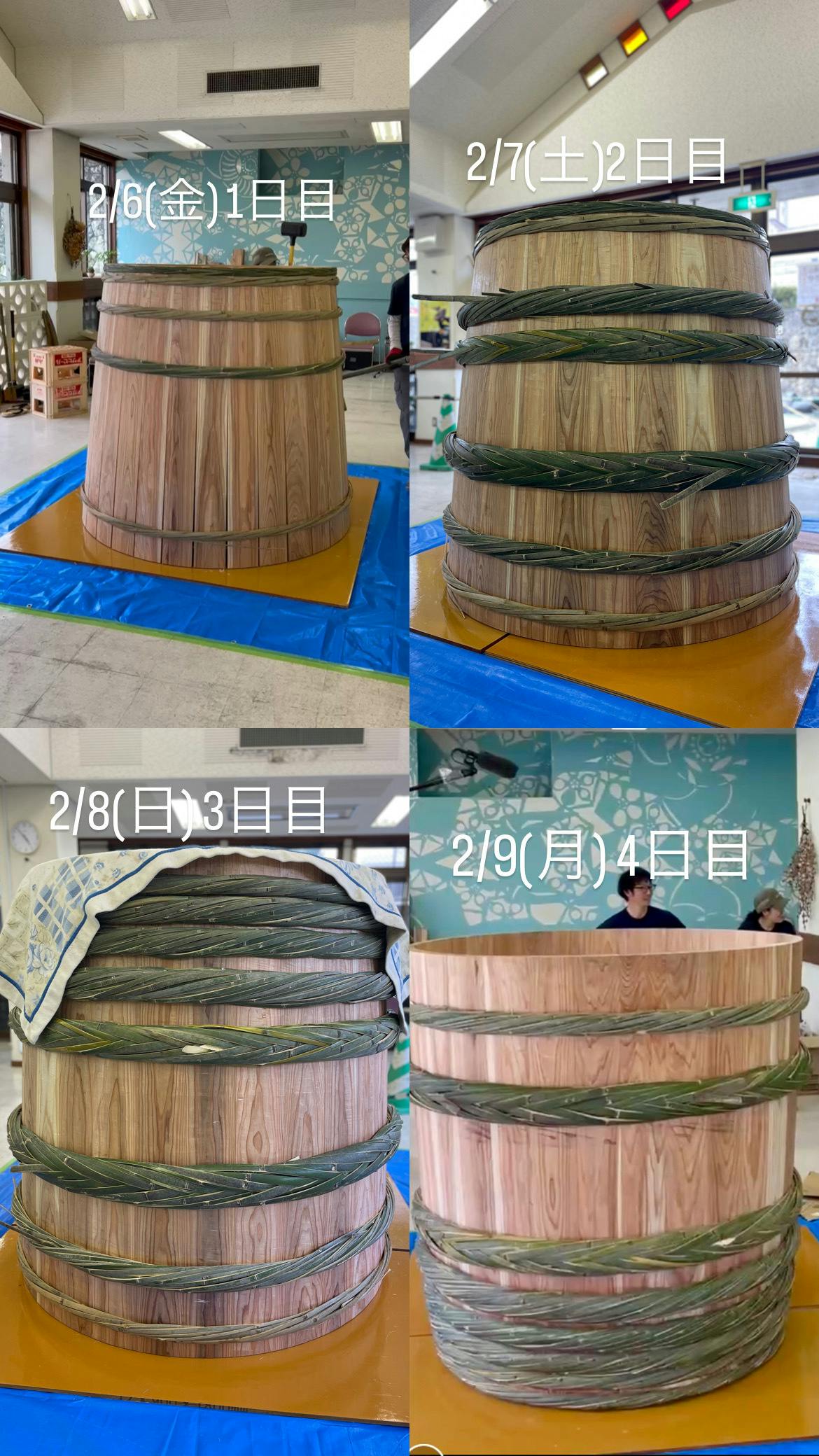 木桶制作1日目には、細い(仮)タガだったものが、日が経つにつれ、太い(本)タガが組まれていき、最後にはしっかりとした(本)タガ8本で締められた立派な木桶が出来上がりました。
