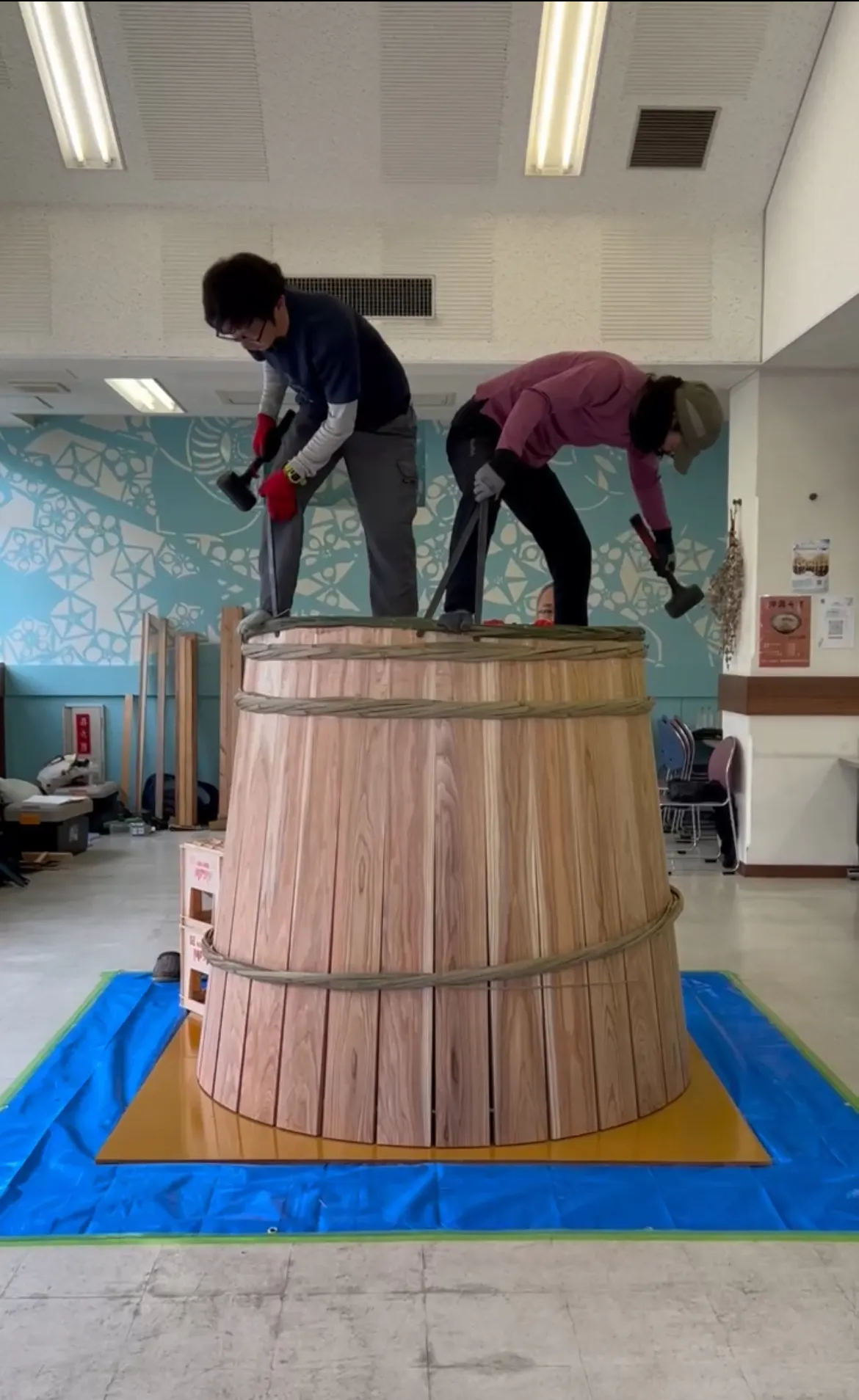 そしてもう1本は長崎、徳島、大阪から集結した木桶職人集団「結い物で繋ぐ会」の御三方に組み上げてもらいました。