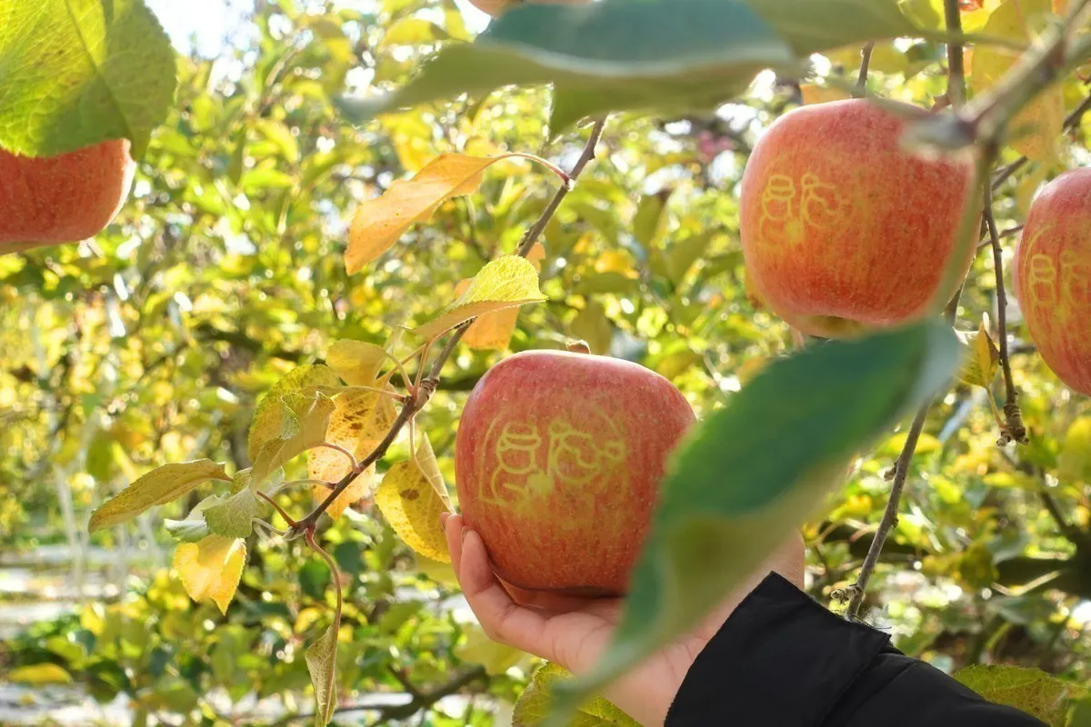 赤く色付く前のりんごにシールを貼ることで、デザインの部分が太陽の日光から遮断され、そこの部分だけ赤く染まらず、デザインが浮き出てくる仕組みです。