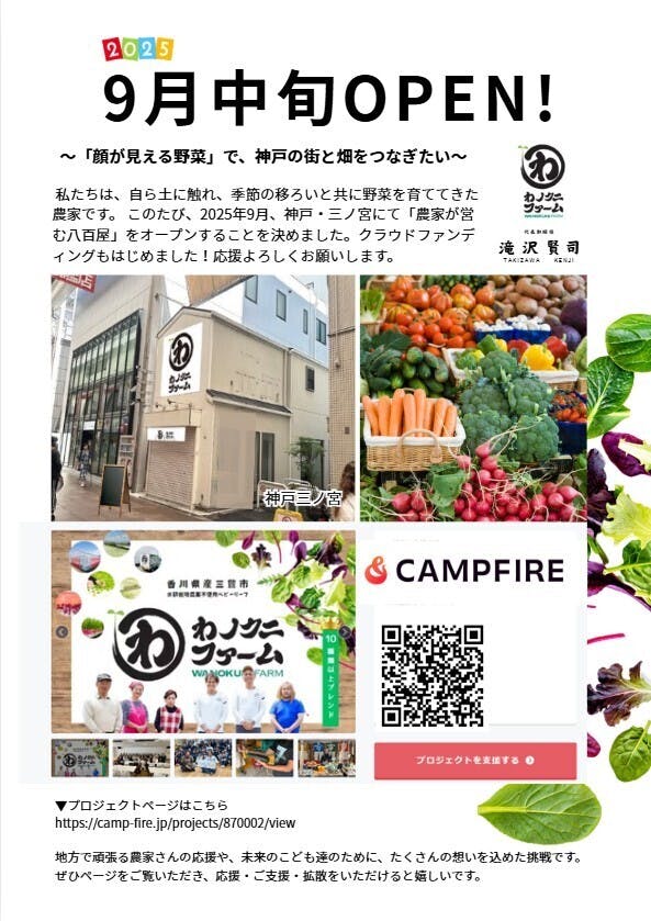 現場より速報ついに「わノクニファーム」神戸三宮の新店舗、看板が設置されました‼農家さんの想いを都会へ届ける拠点、形になってきてます。クラファン進捗は現在 590,000円 / 支援者39人残り7日となりました。最後の追い込みに向けて、応援・シェア・フォロー大歓迎です!