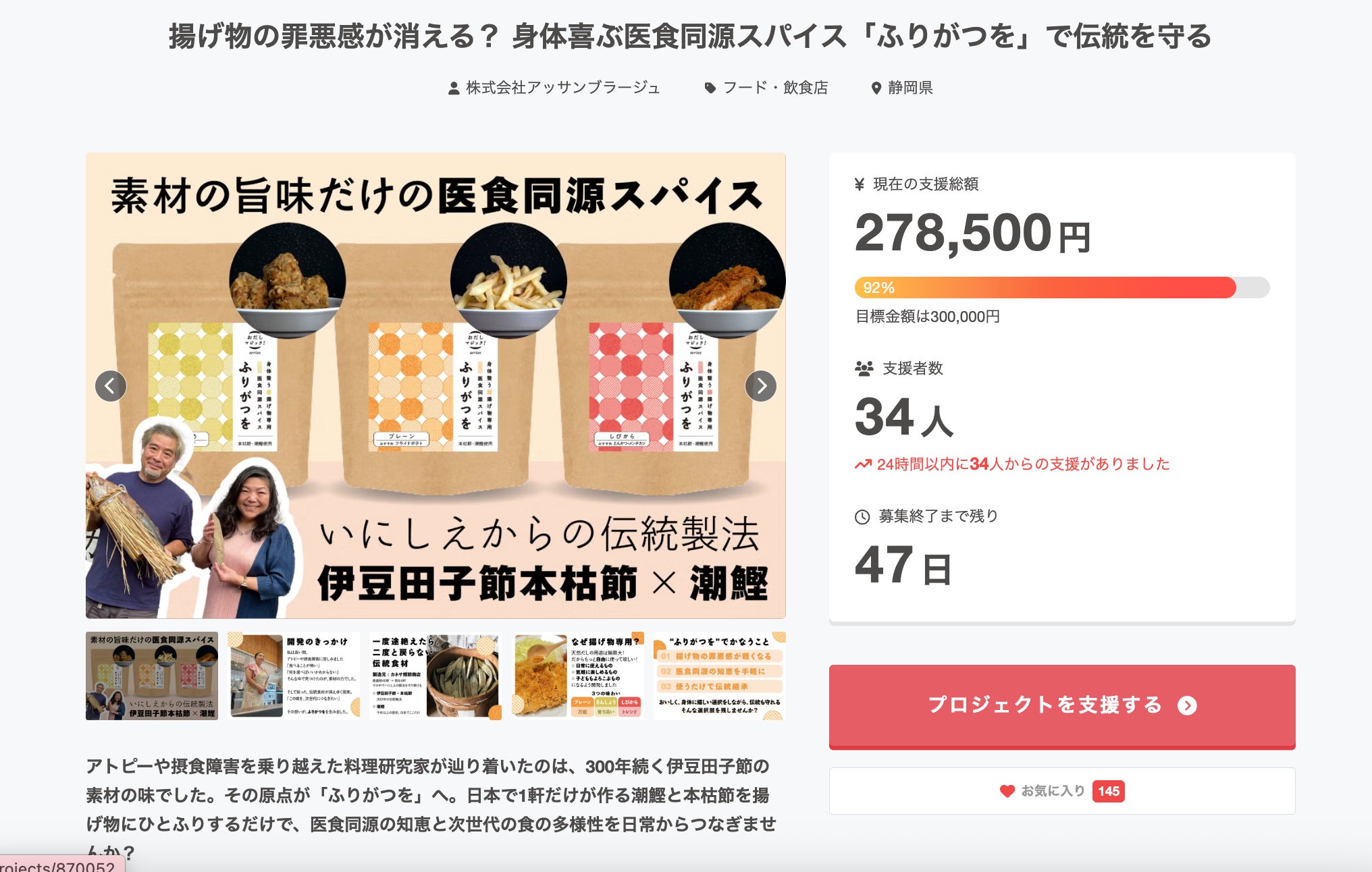 2026/04/14 22:14皆さま、本当に、本当にありがとうございます!本日12時にスタートしたこの挑戦ですが、夜を迎え、なんと【達成率92%】まで到達いたしました。当初は本当にできるだろうか、と、怖くて仕方がなかったこのプロジェクト。でも、今日一日を通してお一人おひとりから届いた温かなお言葉やご支援が、私に大きな勇気を与えてくださいました。目標の100%達成まで、本当にあと一息です。このプロジェクトにお心を寄せていただいたこと、本当にありがとうございます!そして、この素晴らしい勢いを力に変えて、100%達成の先には「ネクストゴール(次なる目標)」を掲げ、さらなる挑戦を続けてまいります! 一人でも多くの方に、日々の食卓から、伝統をつなぐ医食同源のひとふり「ふりがつを」をお届けしたい、と強く願っています。 その一心で、明日からも走り続けます。まずは今夜、不安な昨晩からは想像できなかった奇跡のような初日に心からの感謝を込めて。本当にありがとうございます。 !公開ページはこちらからご覧いただけます。https://camp-fire.jp/projects/870052引き続きよろしくお願いいたします! もっと見る