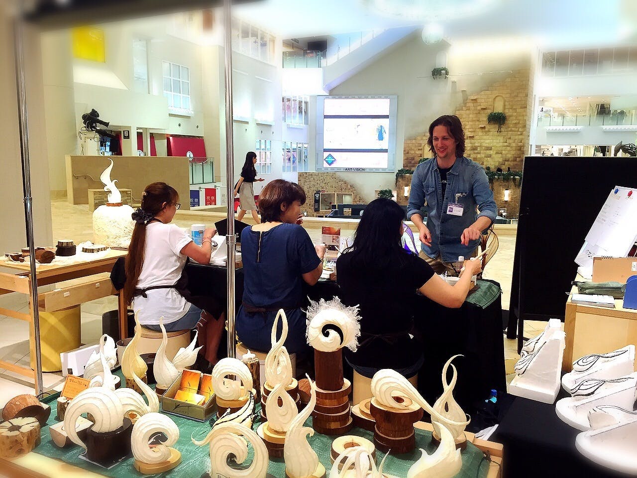 阪急百貨店で、ジェームズが日本人のお客様と一緒にベビーランプのワークショップを行っている様子。