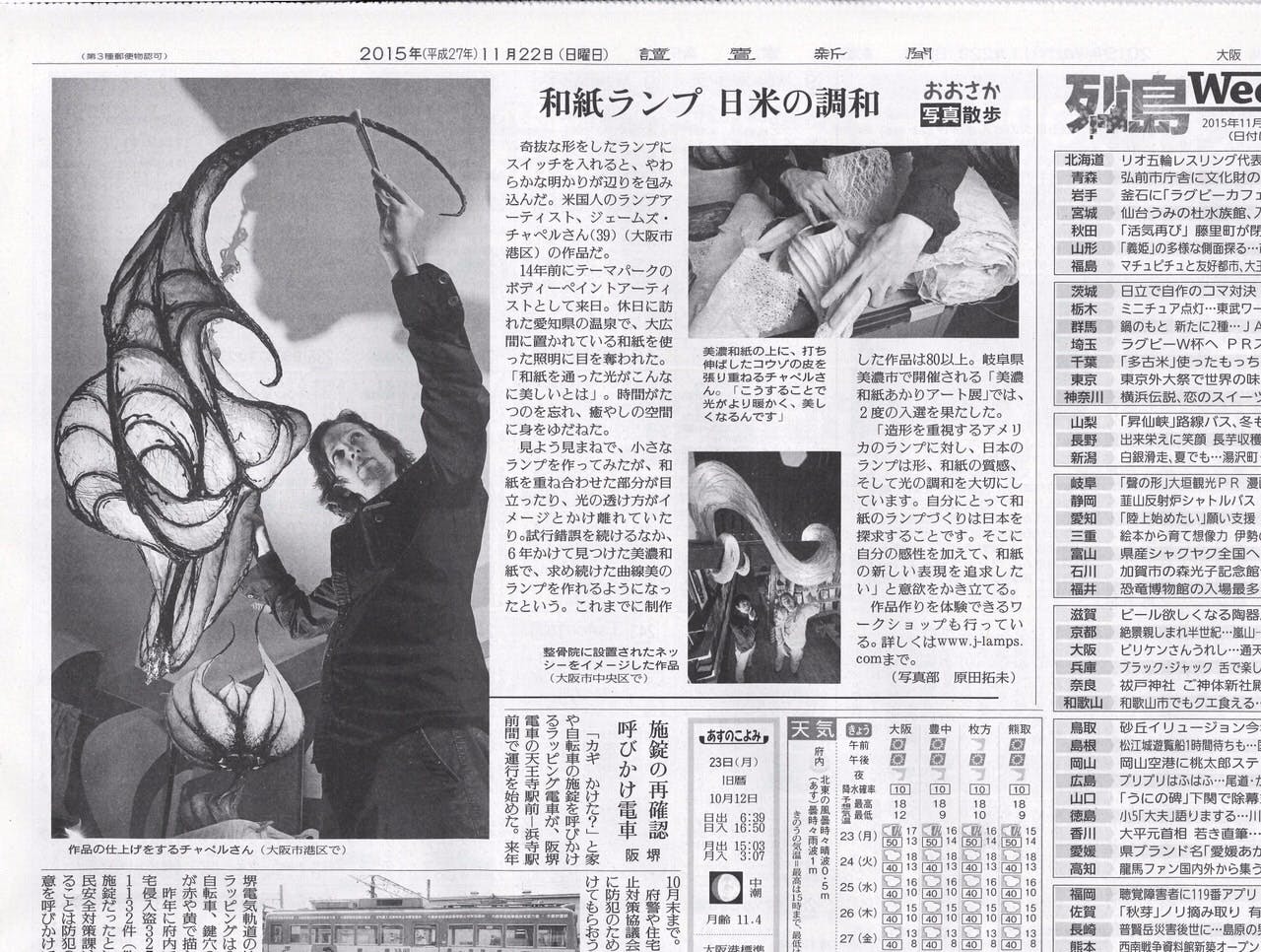 読売新聞に掲載された、ジェームズの和紙とあかりに関する活動を紹介する記事。