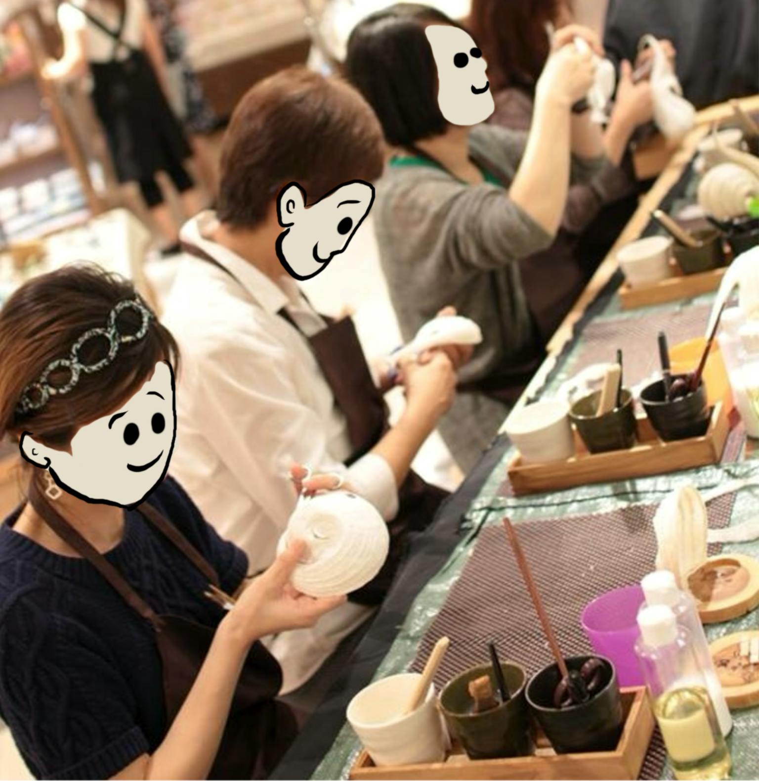 阪急百貨店で、ベビーランプ作りに真剣に取り組む参加者たち。