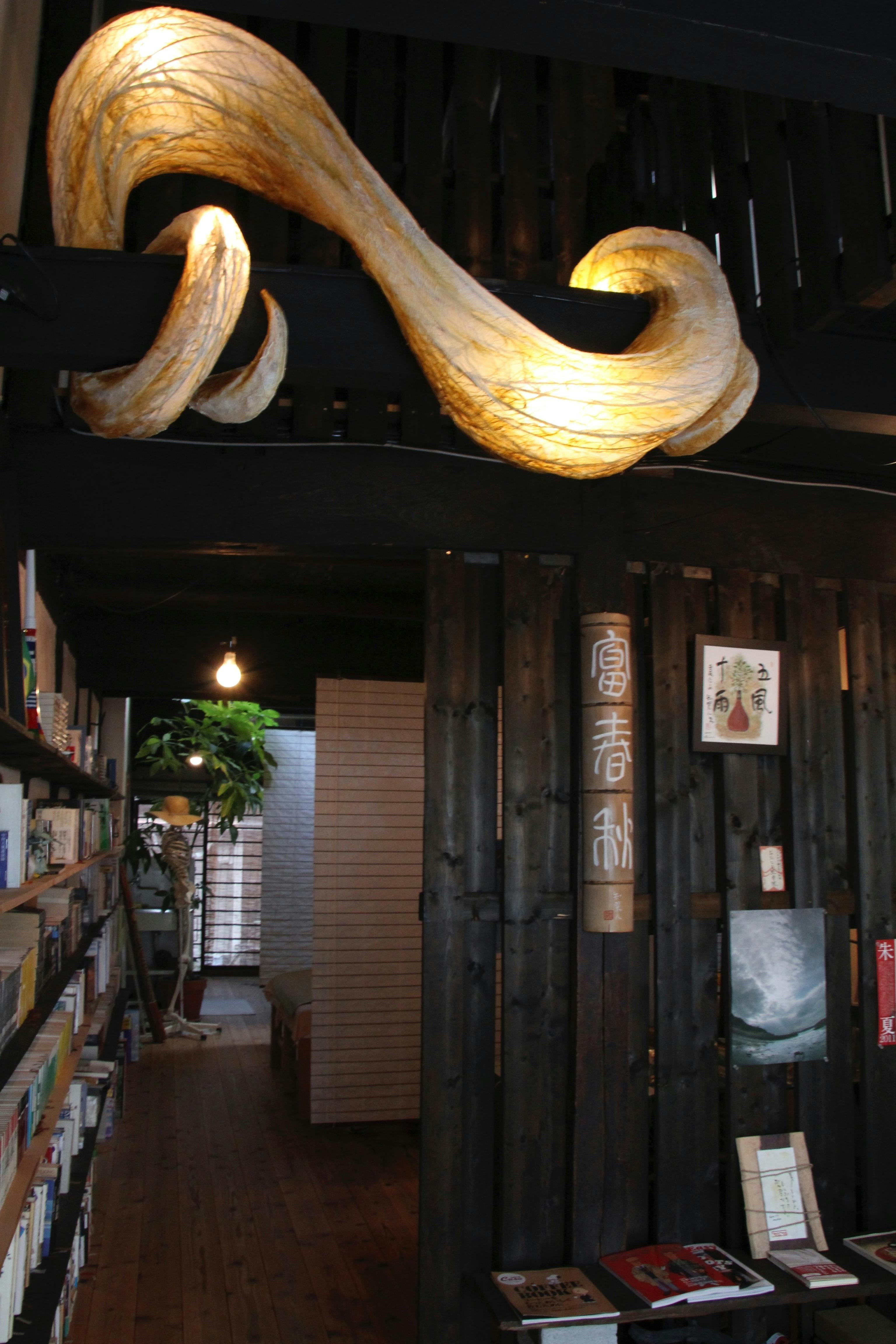 あたたかく柔らかな光、質感のある壁、彫刻のようなフォルム、天井から吊り下げられた繊細な和紙のアートたち。