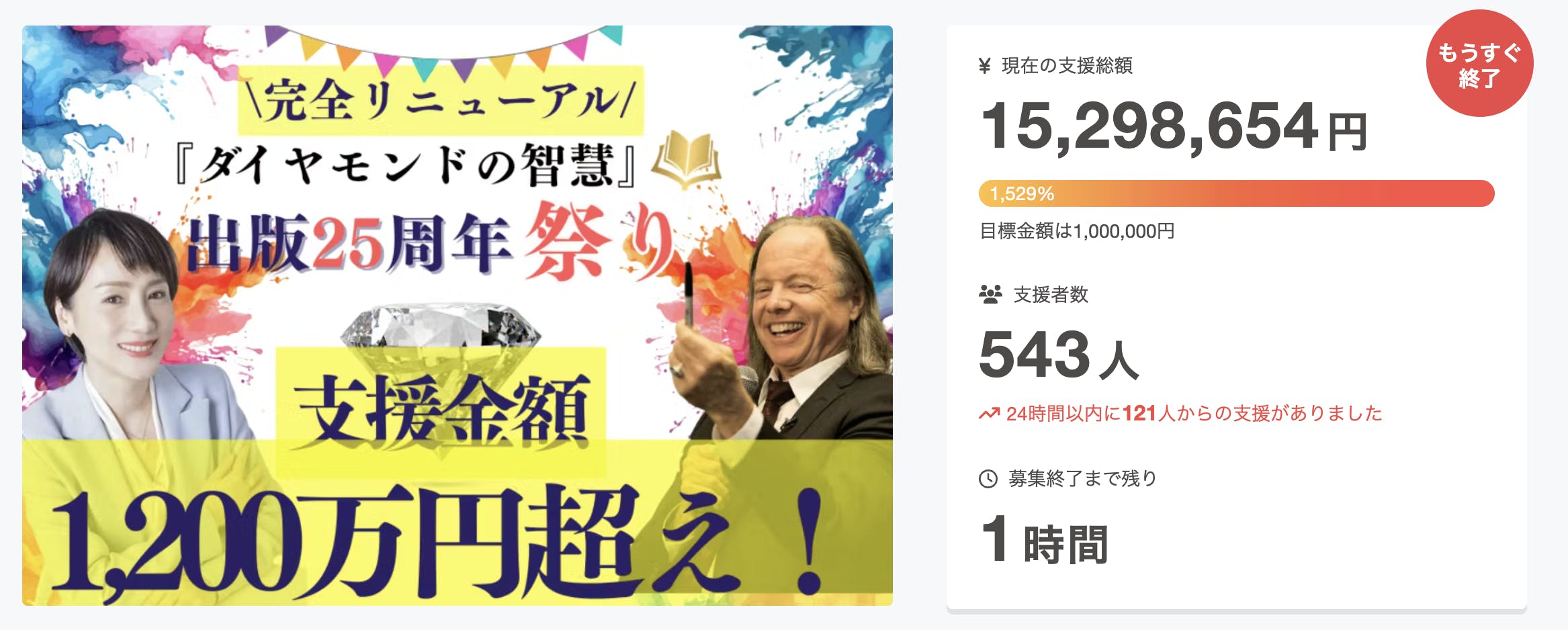 2025/12/17 22:41いよいよあと80分で長かったクラファンも完全に終わってしまいます...現時点で支援金額は1500万円を突破いたしましたー!!!!みなさん本当にありがとうございます!!このクラファンは皆さんに古代の智慧を楽しくお得に学んでいただける様々なリターンをご用意しています!特に、・ソフィーさんのお金のグルコン・ゲシェ先生の瞑想コンテンツ・そしてお茶会リターンといったものは、このクラファンでしか参加できない特別企画となっています!ぜひ最後までクラファンを楽しんでいただけたら嬉しいです!今、ちょうどリアルタイムでライブを開催中ですのでぜひ日付が変わるその瞬間までクラファンの結果を見届けてください!ライブの参加はこちらから!https://us06web.zoom.us/j/88019014827?pwd=kAWNbXvsAbxmXIO6b8FsuglXbUFzu7.1ミーティング ID: 880 1901 4827パスコード: 761306改めてこの度は、クラファンにご参加いただきありがとうございました!!! もっと見る