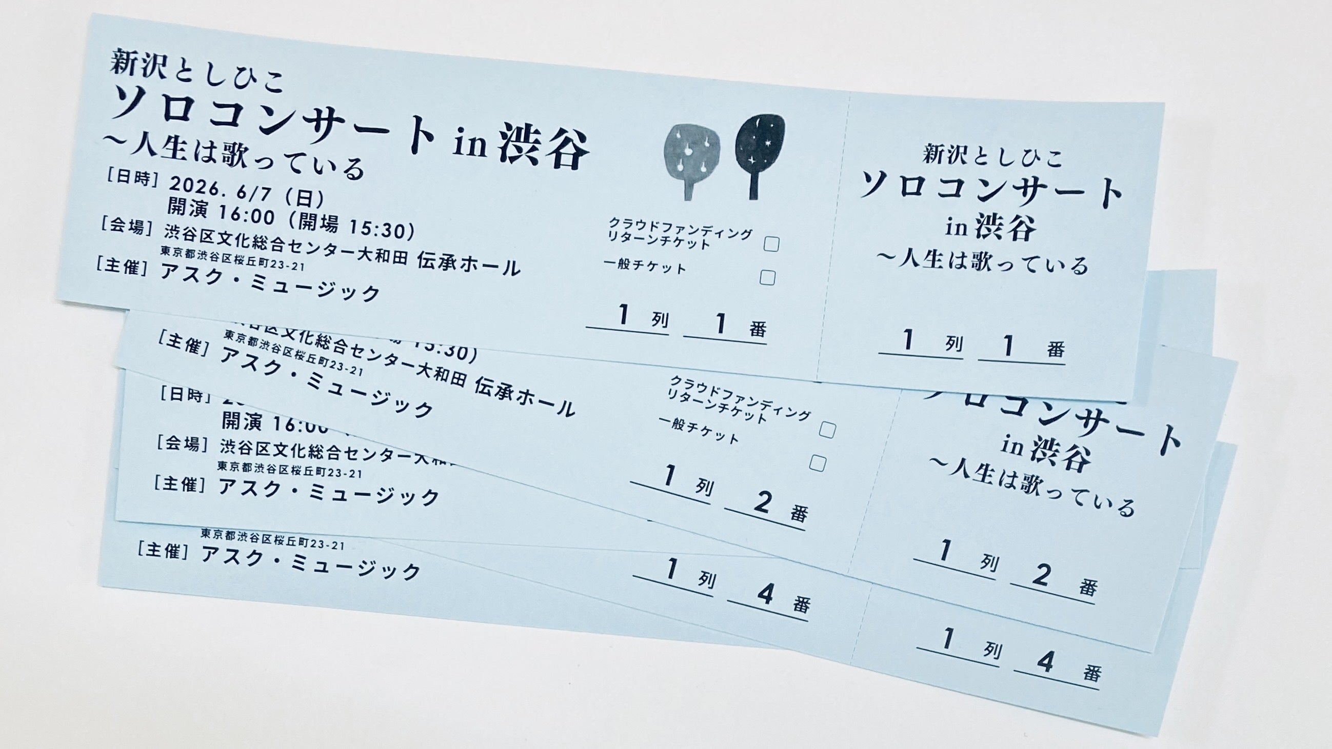 2026/03/07 09:46チケットの発送が始まりましたアスク・ミュージックのスタッフです。クラウドファンディングのリターン「【東京・渋谷】来場チケット〈1枚〉コース」「【東京・渋谷】来場チケット〈2枚〉コース」にお申し込みくださった皆さま、ありがとうございます。3月4日より、チケットの発送を開始しました。まだ届いていない方は、お手元に届くまで今しばらくお待ちください。今回、チケットの各コースには多くのお申し込みをいただきましたが、座席にはまだ余裕があります。アスク・ミュージック オンラインストアでもお申し込みいただけますので、ぜひお知り合いの方をお誘いいただけたらうれしいです。どうぞよろしくお願いいたします。▶︎ 新沢としひこソロコンサートのチケットはこちら もっと見る