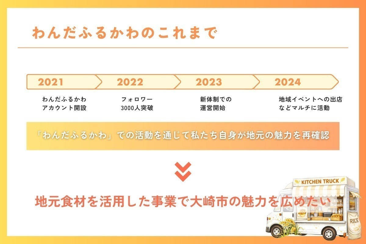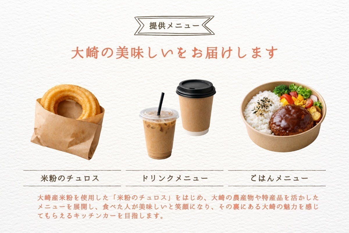 発信力を武器とし活動してきた私たちにできることは、大崎の魅力をキッチンカーにのせ、広め、届けることだと考えこの事業の立ち上げを決めました。