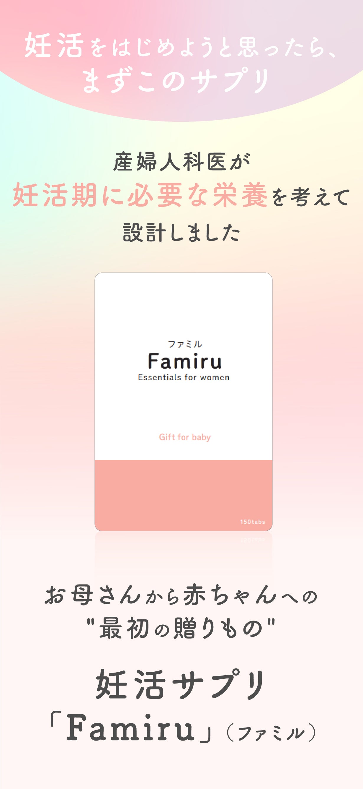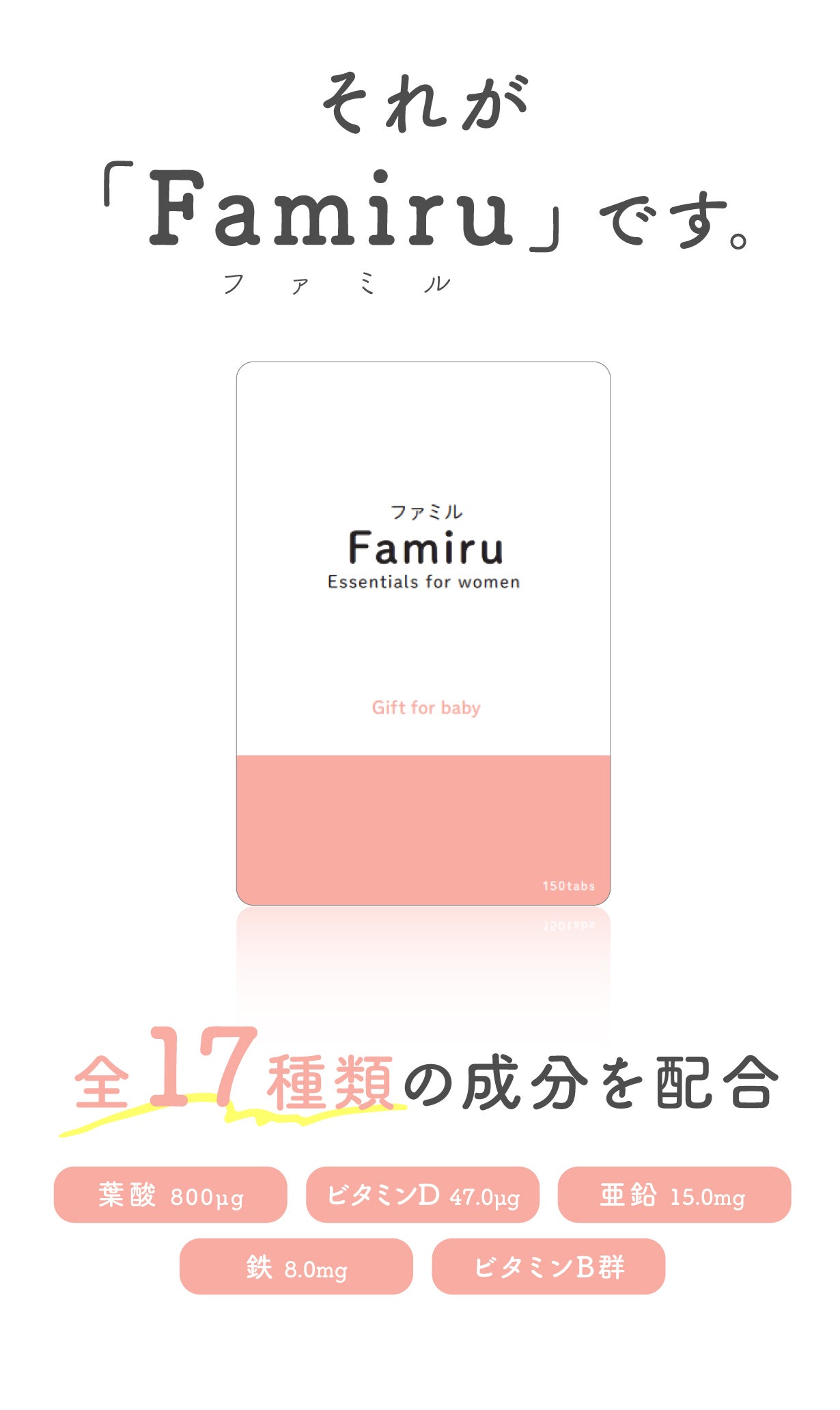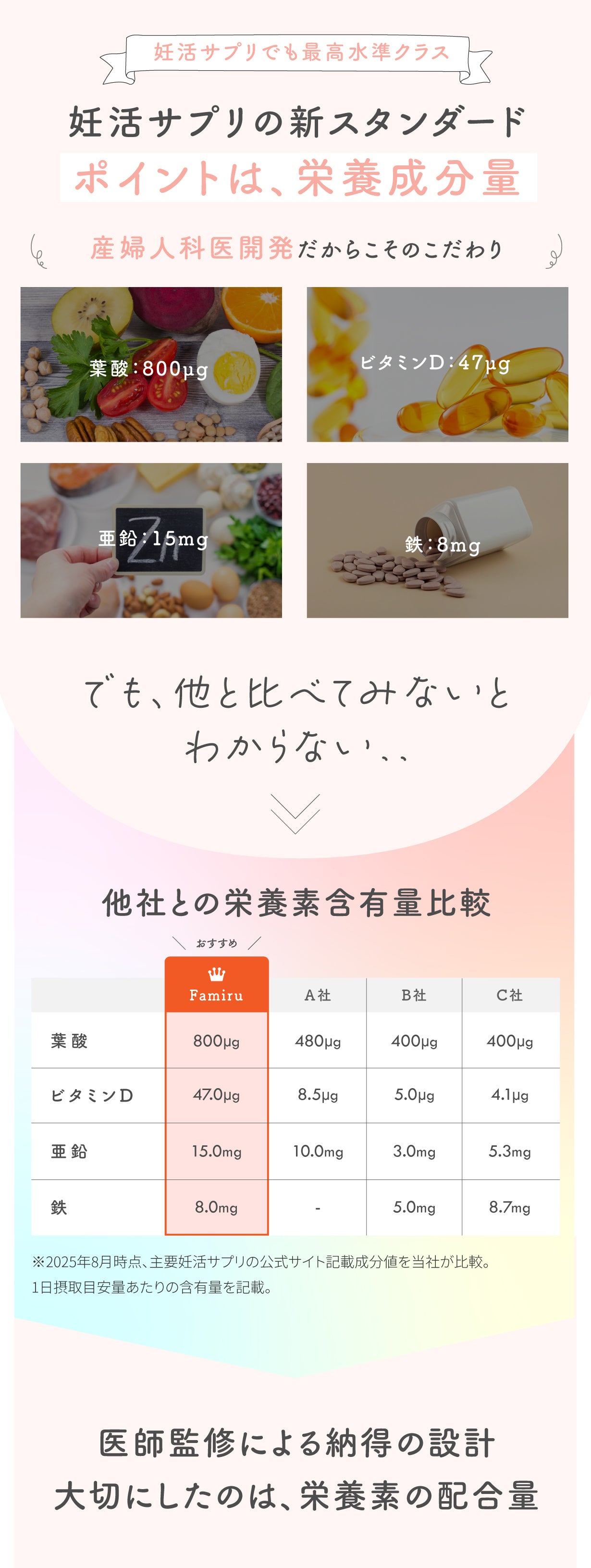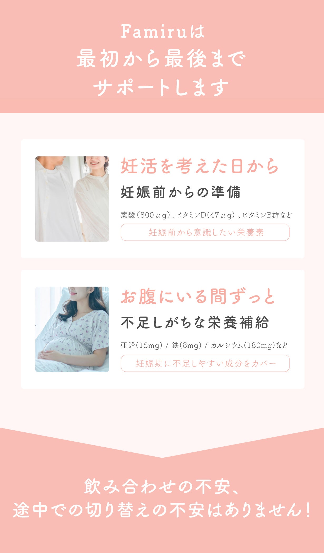 Famiruは医師の視点で"妊活中から妊娠中に必要な栄養素"を過不足なく配合。