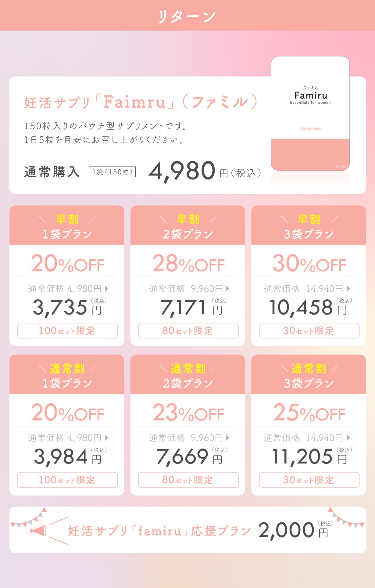 2025/11/06 11:00こんにちは!CAMPFIREでの先行販売がスタートしてから、あっという間に10日以上が経ちました。多くの方にお手に取っていただき、温かいメッセージもたくさん頂戴しています。本当にありがとうございます。「いつも発信を見ています」「応援しています」などのお声が、日々の励みになっています。改めて、心から感謝申し上げます。今回は、一足早くお試しいただいたモニターの方々から届いたお声を少しご紹介します。・小粒で飲みやすい・他社と比べて、成分の種類が全体的に豊富・以前より疲れにくくなった気がする一方で「1日の粒数がやや多い」とのご意見もいただきました。Famiruは、妊活期に必要な栄養をしっかり補うため、1日5粒を目安としています。また、国内のGMP認定工場で製造し、安全性にも徹底的にこだわっています。これからも、皆さまの声を大切にしながら、より良い形を目指していきます。ぜひこの機会に、Famiruをお試しいただけたら嬉しいです。 もっと見る