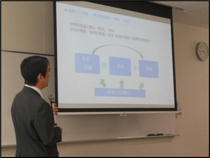 この写真は,今年6月30日(月)に開かれた「修士論文中間発表」で,独自の理論を説明しているぼくです。