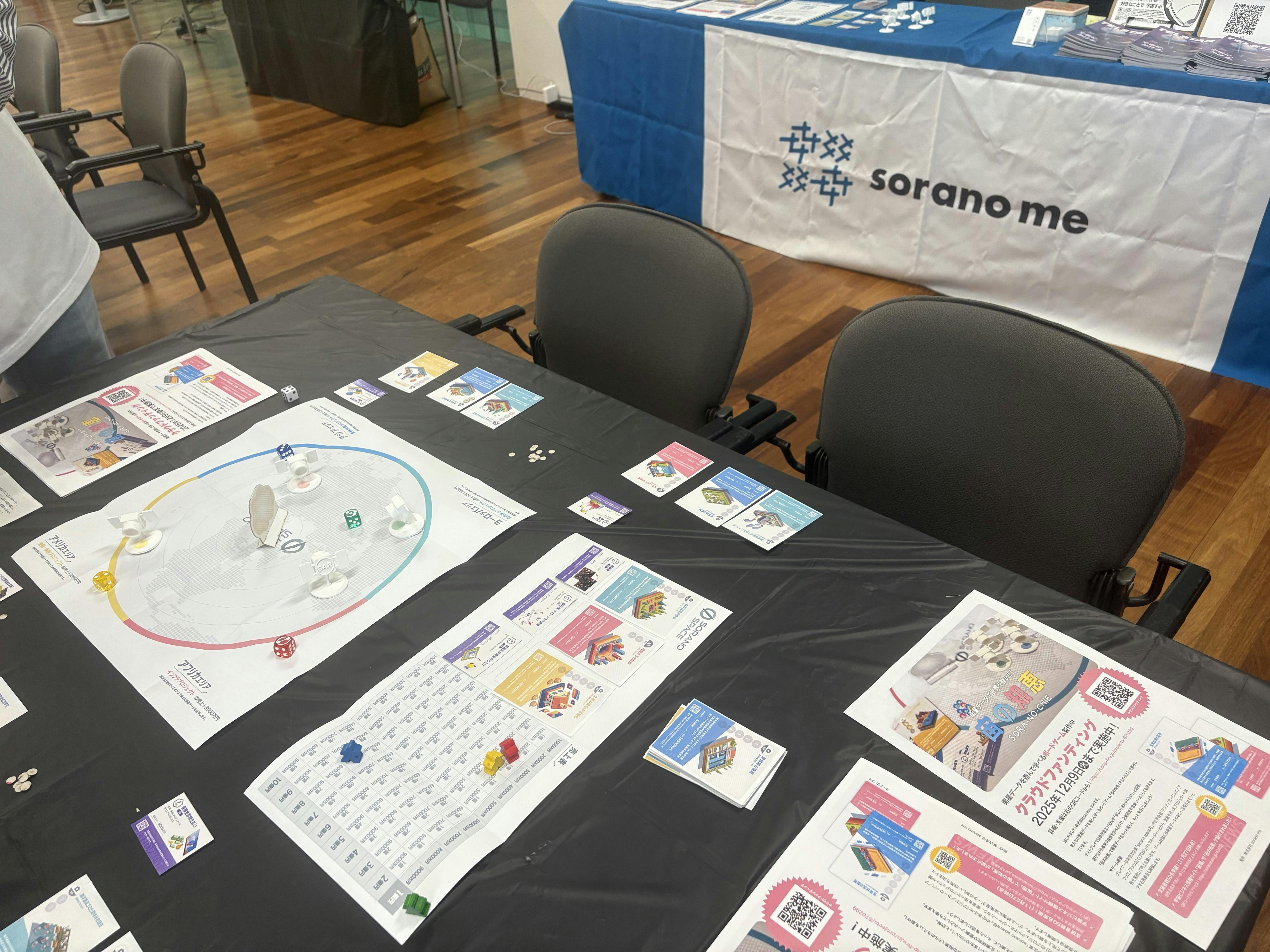 sorano meブースにも多くの人に来ていただき、事業内容を紹介したり、ボードゲームを実際に触っていただいたりしました。クラウドファンディング終了後の販売方法など、さまざまなご意見をいただきました。