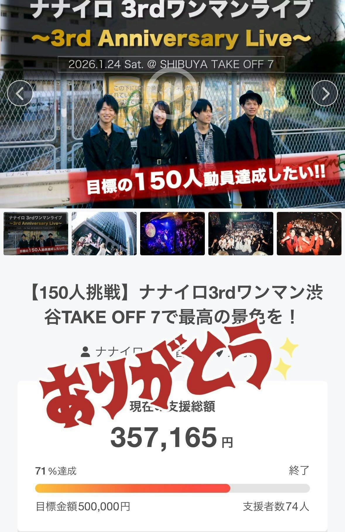 2026/01/09 23:00ご支援して下さった皆様へこんにちは、ナナイロです!3rd ワンマンライブに向けたクラファンにご支援いただき本当にありがとうございました!目標の150人には届かなかったものの、最終的に74名と多くの方々にご支援いただき本当に感謝しております。とても力になりました。本番は1月24日なのであと少しですが、お会いできること楽しみにしております!ライブも楽しみにお待ちいただけたら幸いです。【リターン品について】19日の週には商品が届くように発送手続きをしていきますのでライブに来られる方はぜひグッズを身につけて見に来ていただけたら嬉しいです。今しばらくお待ちください。 もっと見る