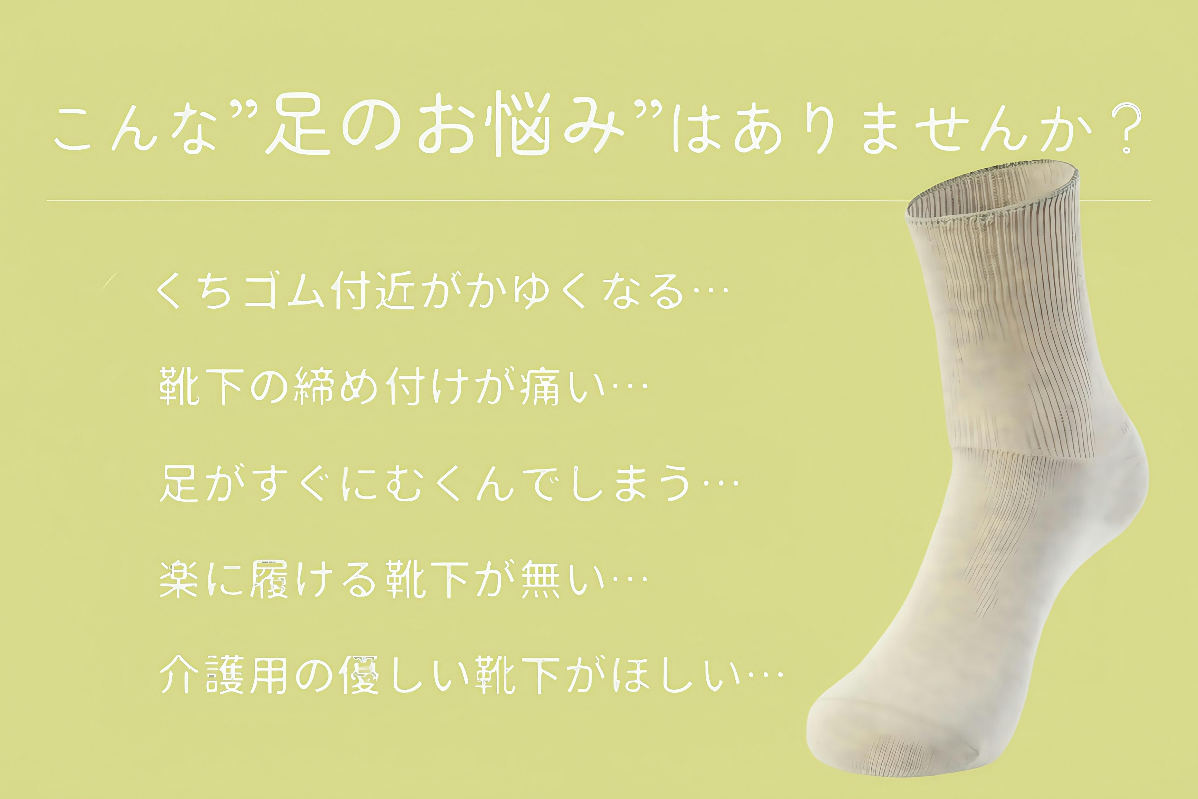 商品名:足が喜ぶ!新しいファイバで[締め付けがゼロ]な靴下を目指し!足の悩みを軽減へ