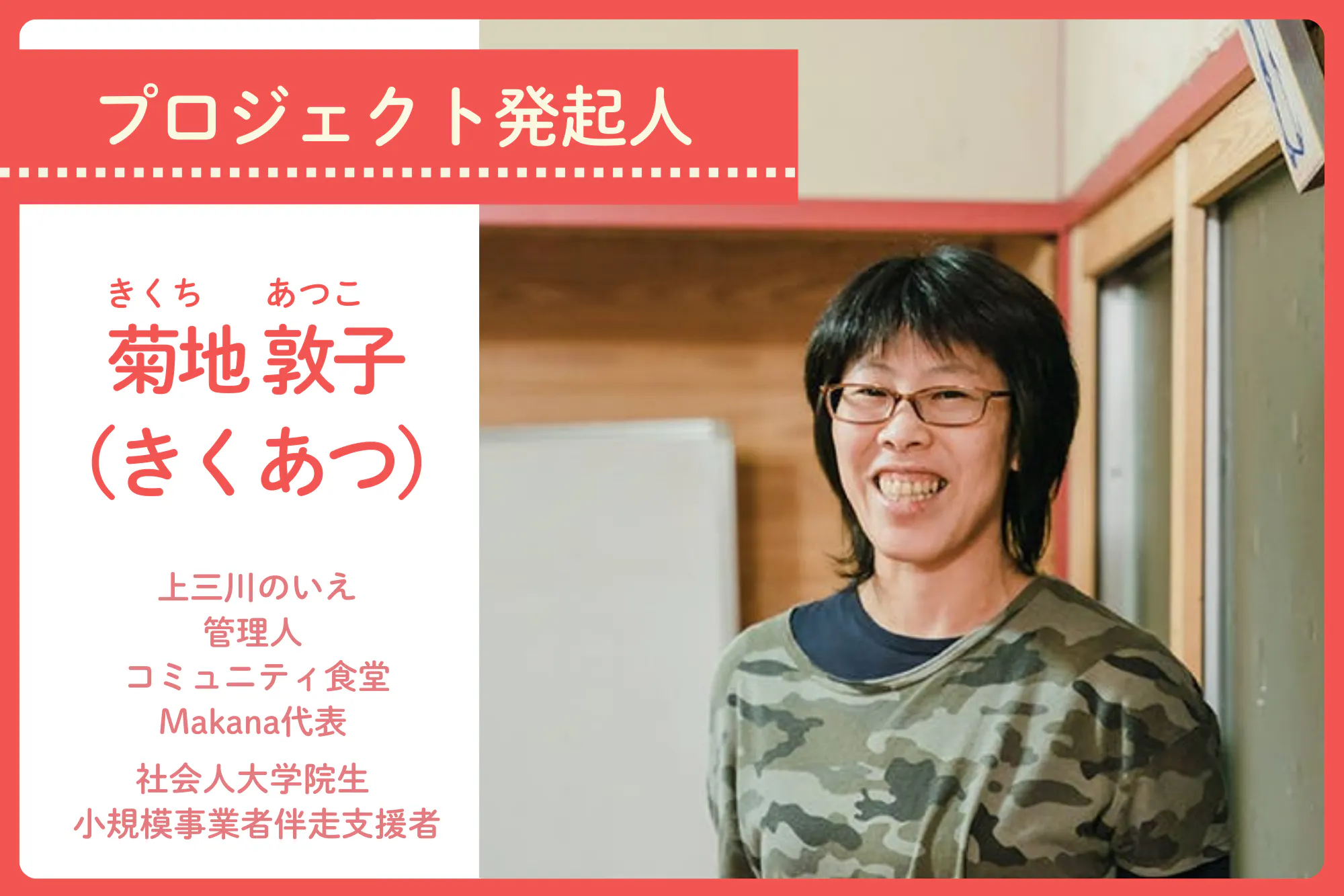 このプロジェクトの発起人、菊地敦子と申します。周りからは「きくあつ」と呼ばれています。