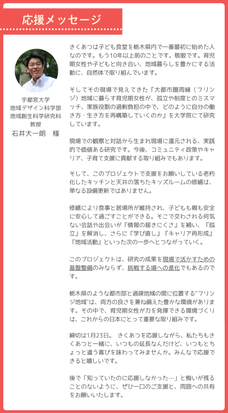 まずは屋根とキッチンの水回りを整えることころから始めて、コミュニティ食堂Makanaとして運営できる設備をしっかり整えたい。そしてもしわたしに何かあっても、信頼できる人たちがわたしの代わりに子どもたちにご飯を作る体制を整えたい。そして更に、子どもたちが若者になってやりたいことを見つけたときに気軽に始められる場所として、上三川のいえを進化させていきたいと思っています。