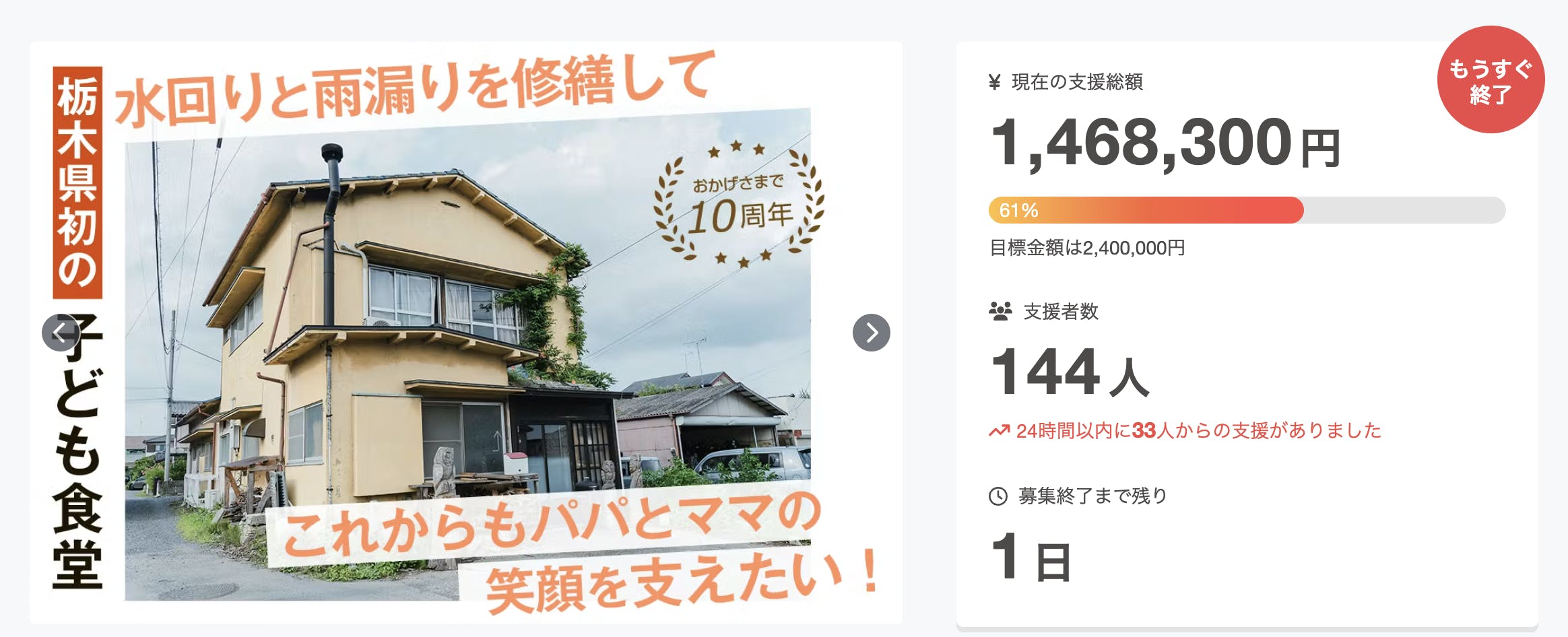 2026/01/22 08:06クラファン残り1日。達成まで あと93万円。ここまで積み上げてこれたのは、応援してくれたみんなのおかげです。支援してくれた方、シェアしてくれた方、気にかけてくれた方、メッセージをくれた方——本当にありがとうございます。最後の1日、あと93万円。でも、ここまで来たからこそ「届かなかった」で終わらせたくない。この場所を、次の一年、次の世代につなぐために。どうか、最後の一押しをください。今回のクラファンの目的は、・古くなったキッチンの修繕(工事済み)・湿気でボロボロになってしまったキッズスペース(天井)の補修(これから工事、こっちの方が大変!)ただ直すだけじゃありません。ここは、誰かが「やってみたい」と思った時に気軽に挑戦できる場所であり、子どもたちが安心して過ごせる居場所であり、地域の人がふらっと立ち寄れて、また明日を頑張れる“拠点”です。その土台が傷んでしまった今、ちゃんと整えて、次のチャレンジが続く環境にしたいんです。だから、最後のお願いさせてください。▶︎お願い 2つ!①シェアしてください(今日が一番効きます)タイムラインの流れは早くて、「気になってたけど見逃してた」人が本当に多いです。あなたのシェアが、誰かの“見るきっかけ”になります。もしすでにシェアしてくれていたら…図々しいけど 再シェア、お願いします。今日の再シェアが一番届きます。②追加支援も、可能ならお願いします(少額でも本当に力になります)「もう支援したから…」って、最後の局面はみんなの小さな一押しの積み重ねが一番効きます。1000円でも、2000円でも、増えていくたびにゴールが現実になります。少額3,000円のリターンも追加しました。そして、最後の夜は——一緒に迎えたい。1月23日 0:00から、つまり今日の深夜からカウントダウンライブをスタートします!覗きに来てね〜!コメントだけでも、見守りだけでも大歓迎。「見てるよ」「あと少し!」「支援したよ!」「再シェアしたよ!」その一言が、燃料になります。ライブで状況も共有しながら、最後の最後まで走ります。ここまで来たのは、私ひとりの力じゃありません。だから最後も、一緒に目撃したいです。残り1日。あと93万円。シェアでも、追加支援でも、ライブに覗きに来るだけでも。あなたの力を、ほんの少しだけ貸してください。一緒に、達成の瞬間を迎えましょう。カウントダウンライブは、facebook Instagramこちらで開催します。 もっと見る