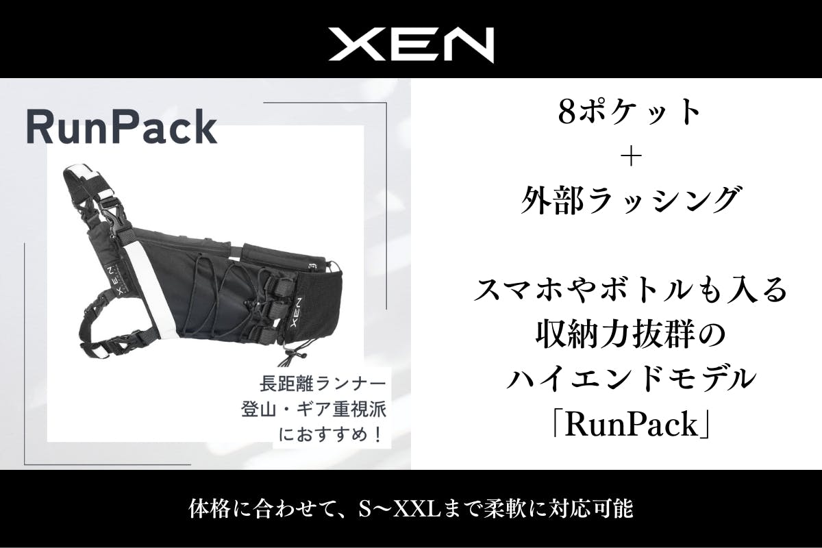 (モデルによって変動:RunPackの場合は、ファスナー付×4、マジックテープ付×2、外部ラッシング×2)・収納例:スマホ、鍵、財布、250mlボトル、ウィンドブレーカー、サングラスケース など