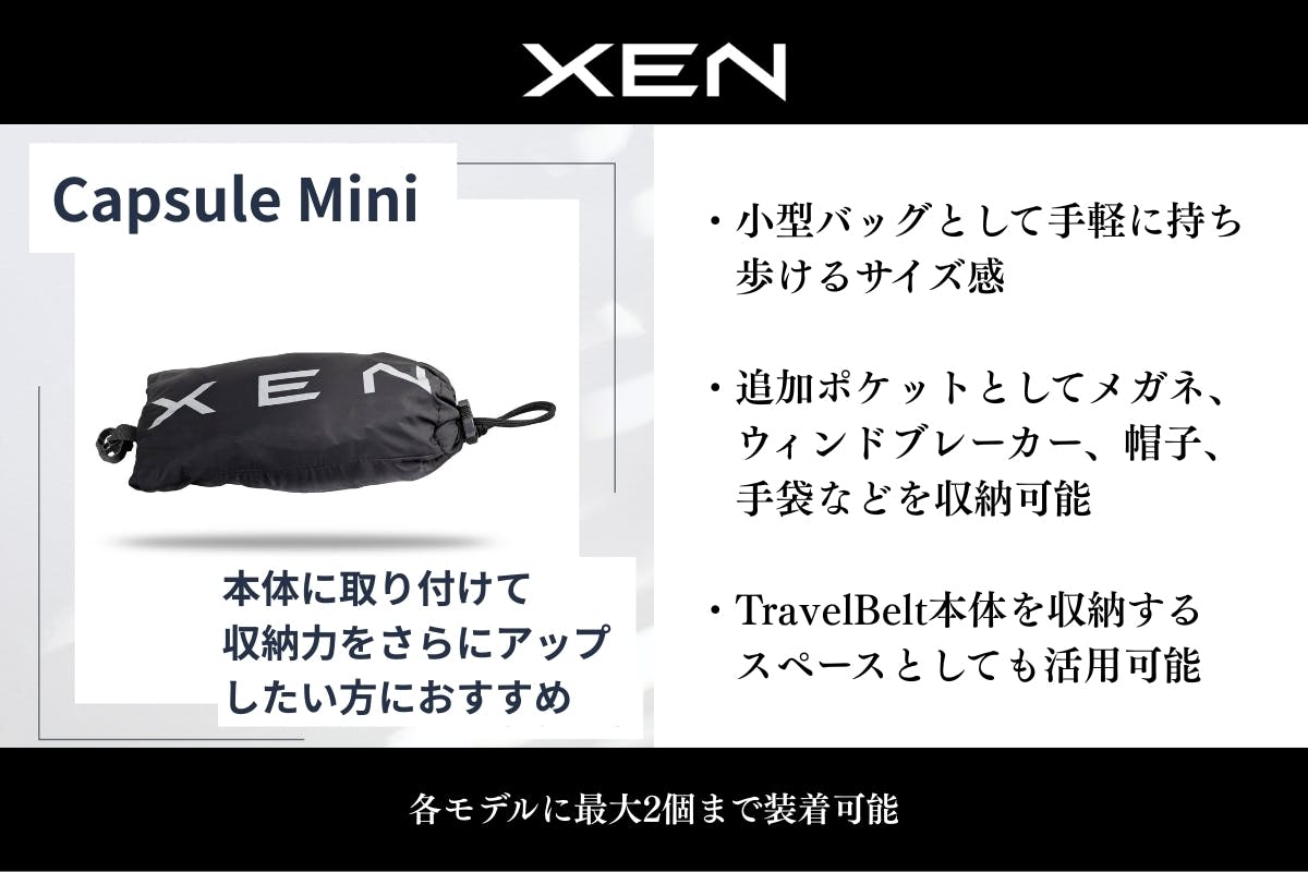 (モデルによって変動:RunPackの場合は、ファスナー付×4、マジックテープ付×2、外部ラッシング×2)・収納例:スマホ、鍵、財布、250mlボトル、ウィンドブレーカー、サングラスケース など