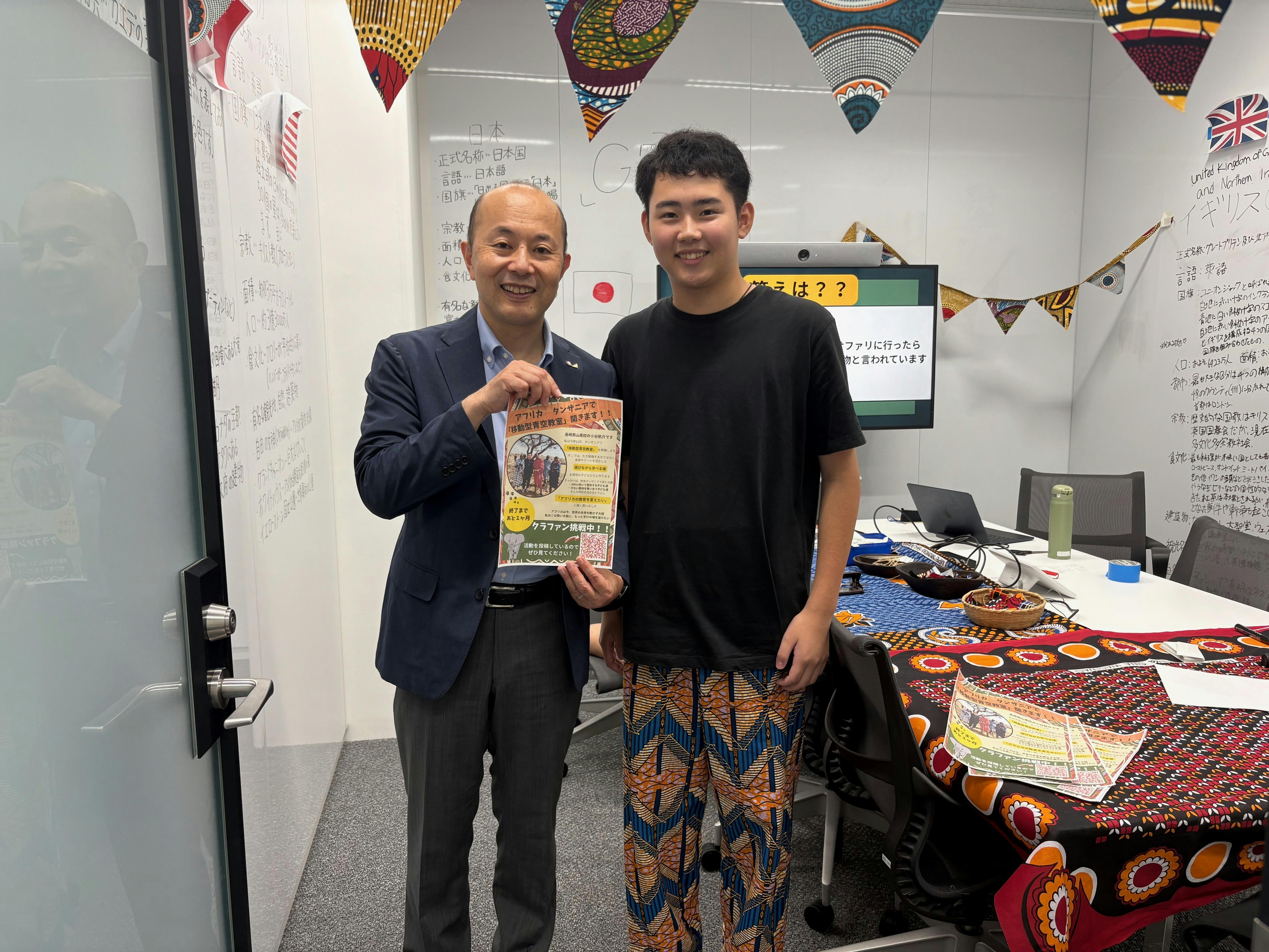 2025/09/23 21:02活動報告こんにちは!小谷航介です。クラウドファンディングが残り1ヶ月を切り、残り期間も少しずつ短くなってきました。おかげさまで達成率は66%を突破し、目標達成までもう少しというところです。とはいえ、まだ残りの34%ほどの支援が必要な状況です。より多くの方に活動を知っていただき、共感していただけるよう、今後も積極的に発信を続けていきます。活動内容ながさKids Townへの出展9月14日・15日に開催された「ながさKids Town」にブースを出展しました。当日は、アフリカの伝統布「カンガ」を使った工作体験やクイズ大会を実施。子どもたちはもちろん、保護者の方や長崎市長さんにもお話をする機会をいただき、自分の活動やアフリカ教育の課題について多くの方に知っていただくきっかけとなりました。濱屋商店での社内プレゼン9月20日には、以前イベントで出会った濱田屋商店の代表取締役・濱田さんにお願いし、社員の皆さまに向けてプレゼンする機会をいただきました。高校生活ではなかなか経験できない、大人の方々に直接自分の思いを伝えるとても貴重な機会となり、多くの応援やご支援をいただきました。最後にこのように、少しずつですが活動の輪が広がり、応援してくださる方々が増えてきています。残り期間も全力で走り抜け、目標を達成したいと思っています。引き続き、ご支援・ご協力・そして情報の拡散をしていただけるととても嬉しいです。 もっと見る
