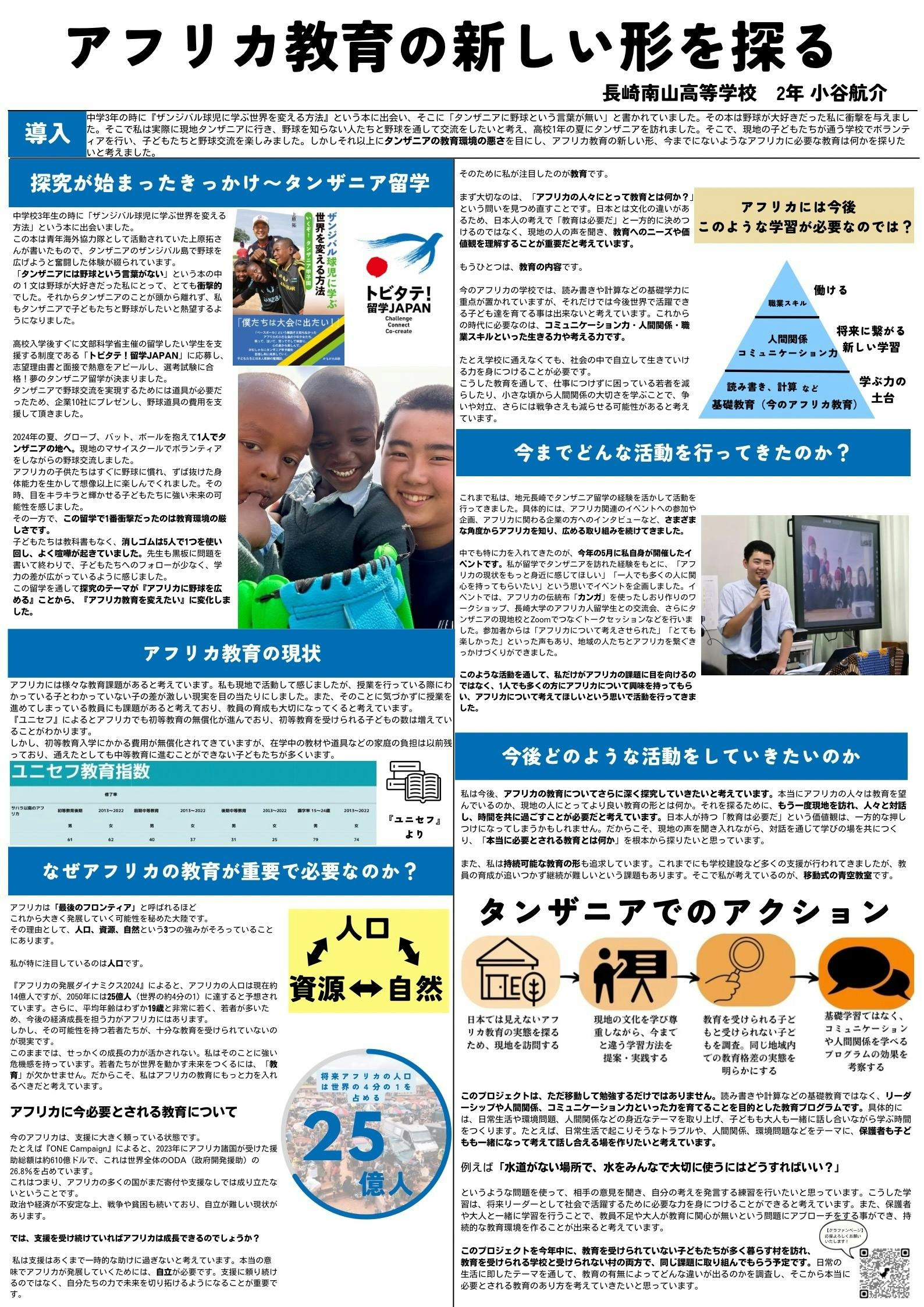 当日は、これまでの活動の歩み、現在取り組んでいること、そして今後実現したいことについて、研究発表ポスターとしてまとめ発表しました。多くの方々にブースを訪れていただき、大学生や教授の方、大人の方々など、アフリカに関心のある人もそうでない人も、幅広い方々とお話をすることができました。自分の思いを直接伝えられたことは、私にとって大変貴重な経験でした。
