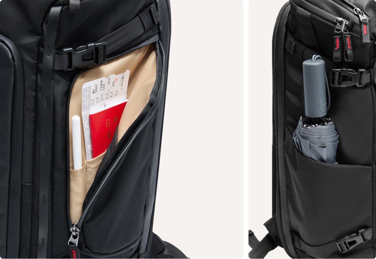 防水クイックポケット: トップのガジェットポケットとサイドの書類ポケットに、防水ファスナーと防水コーティング素材を採用。電子機器や重要書類を安心して収納できます。
