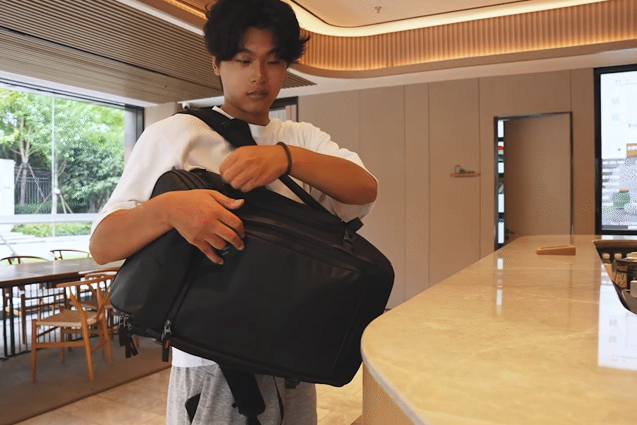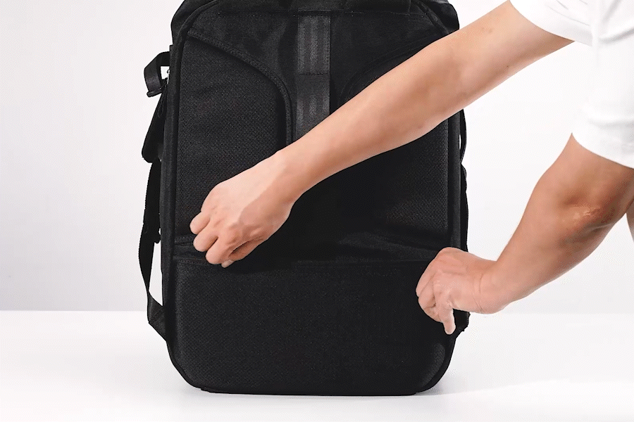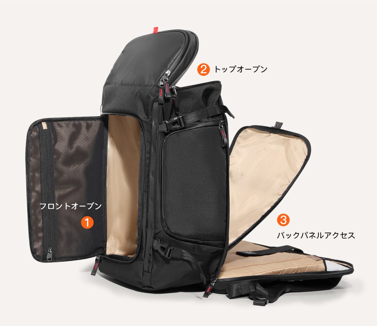 1秒オープン: ジッパーに追加した補助プルタブを引くだけで、背面からメインコンパートメントを素早く開けられます