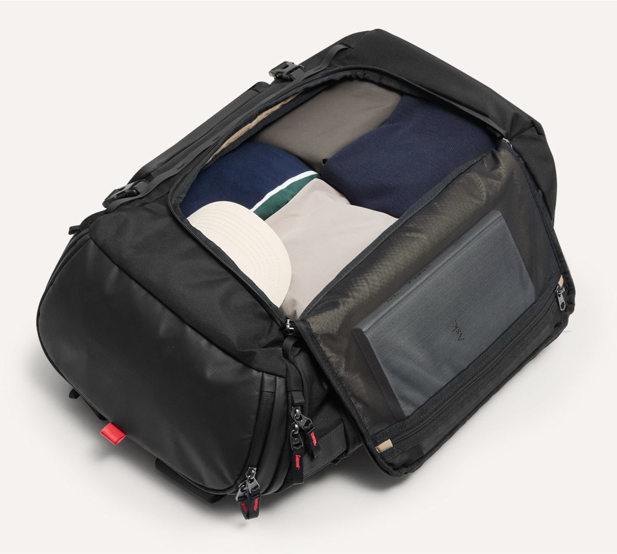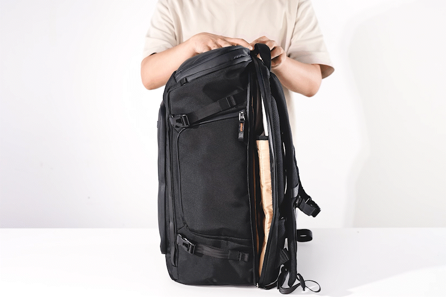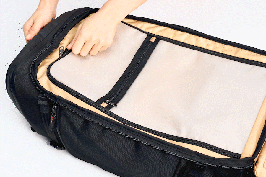 3WAYメイン開口部: 上部、フロント、背面の3方向からメインコンパートメントにアクセス可能。上にある衣類でも底にある小物でも、欲しいものをサッとすぐに取り出せるので、中を散らすことなく整頓された状態を保てます。
