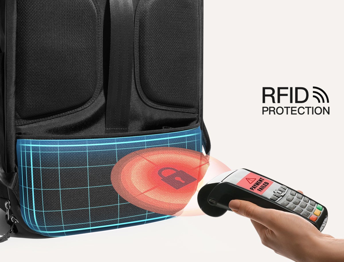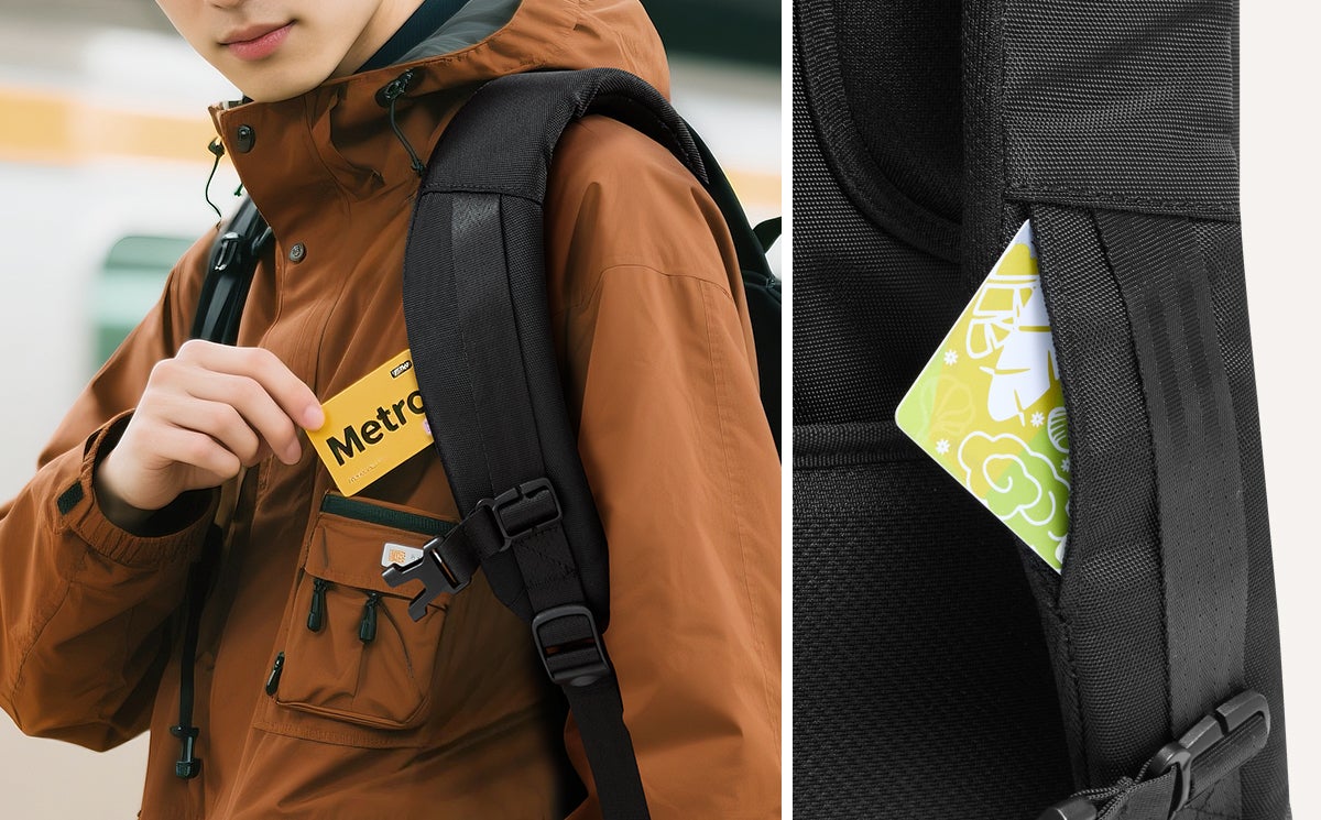 身体側に密着する背面隠しポケットはRFID遮断機能付きで電子スキミングを防止し、貴重品を安全に保管します。