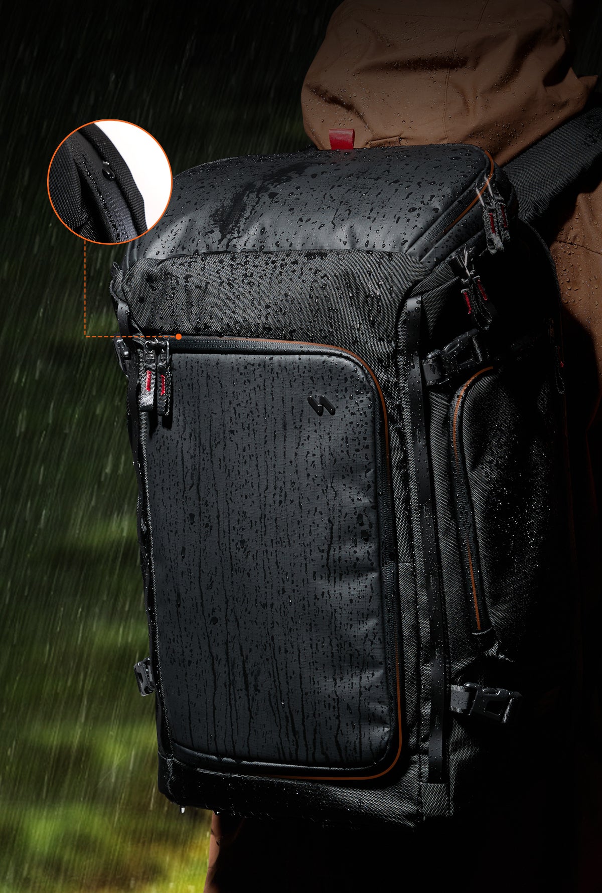 防水ジッパー: 前面の開口部にはすべてSBS防水ジッパーを採用。雨水の侵入を防ぎ、大切な中身をしっかり守ります。