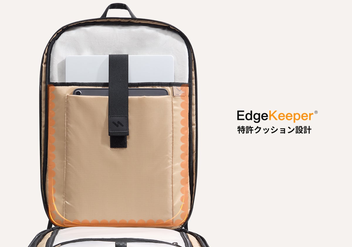 ノートPC用収納室に特許取得のEdgekeeper保護クッション構造を採用、ノートPCを衝撃から守ります。