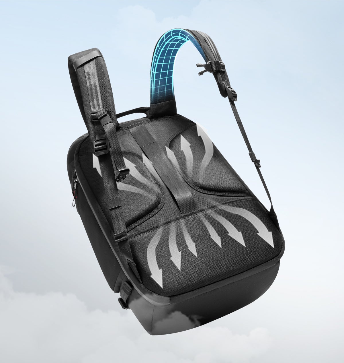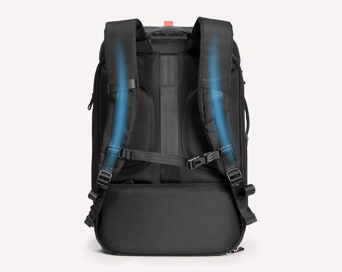 背面に立体通気性メッシュを採用し、熱と汗を効果的に逃がします。長時間背負っても、快適なドライ感を持続。