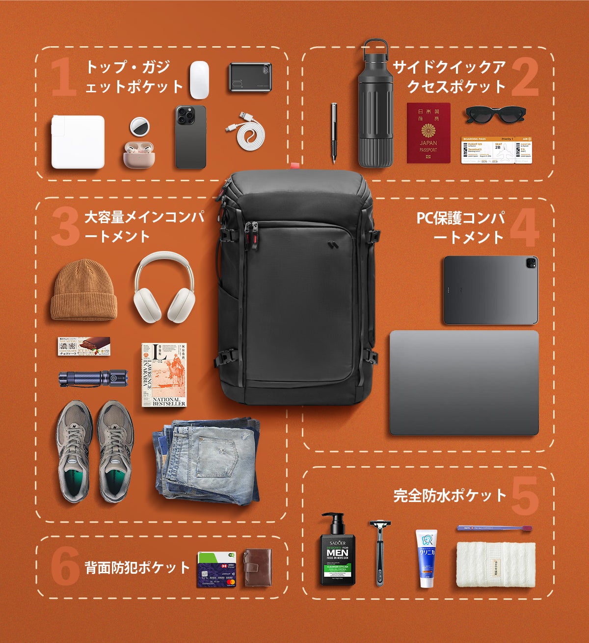 ・効率収納:メイン収納には6つの仕切り+前後ポケットを搭載。イヤホン、充電器、ケーブル、モバイルバッテリー、ペン類までスッキリ整理。