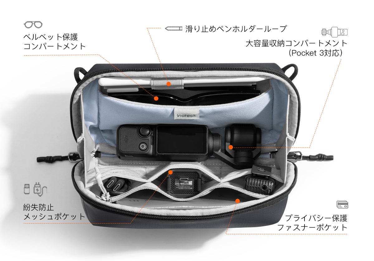 ・素早く取り出し:メイン収納は60°オープンのアコーディオン構造。開けると自立し、中身が一目で分かり取り出しもスムーズ。