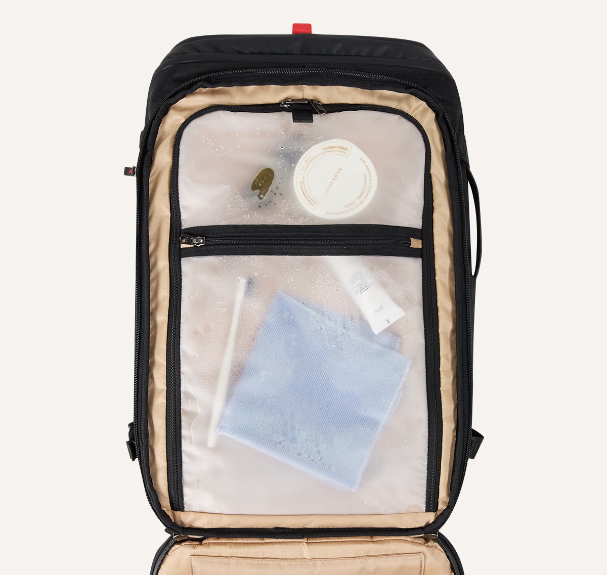 水漏れ防止の透明ポケット:洗面用品や濡れたタオル・衣類を収納でき、他の荷物を濡らす心配がありません。バッグ内は常に清潔で快適な状態を保ちます。
