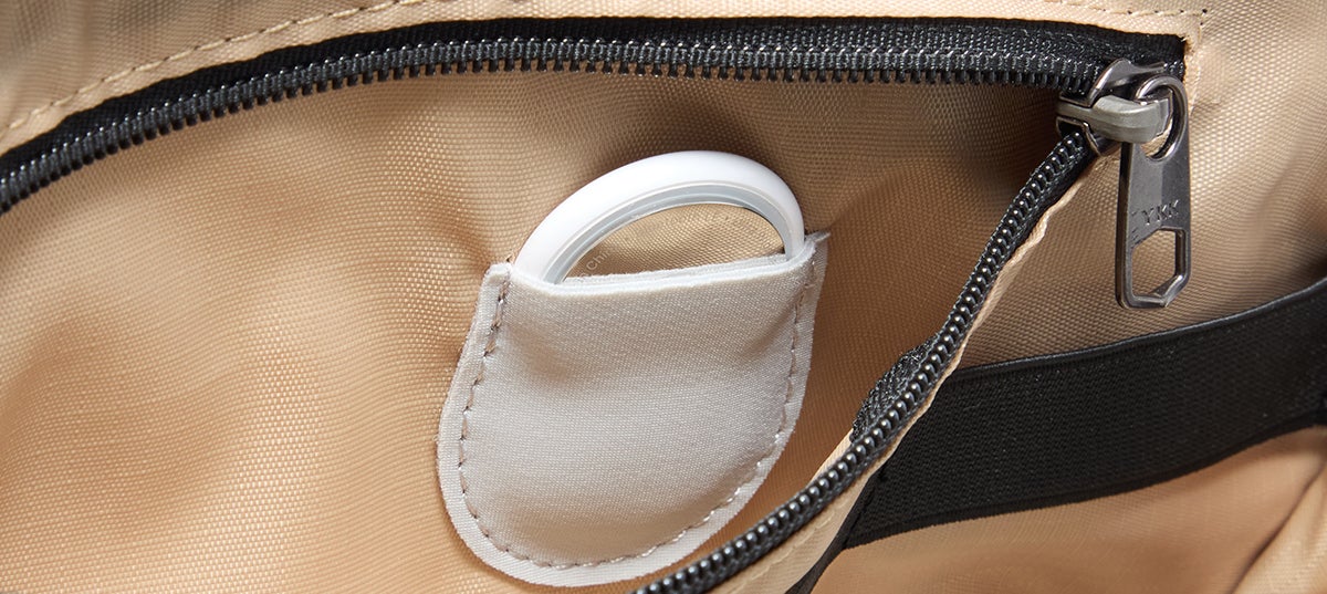 内蔵の専用ポケットにAirTagをセットすれば、バッグの位置をいつでも確認可能。