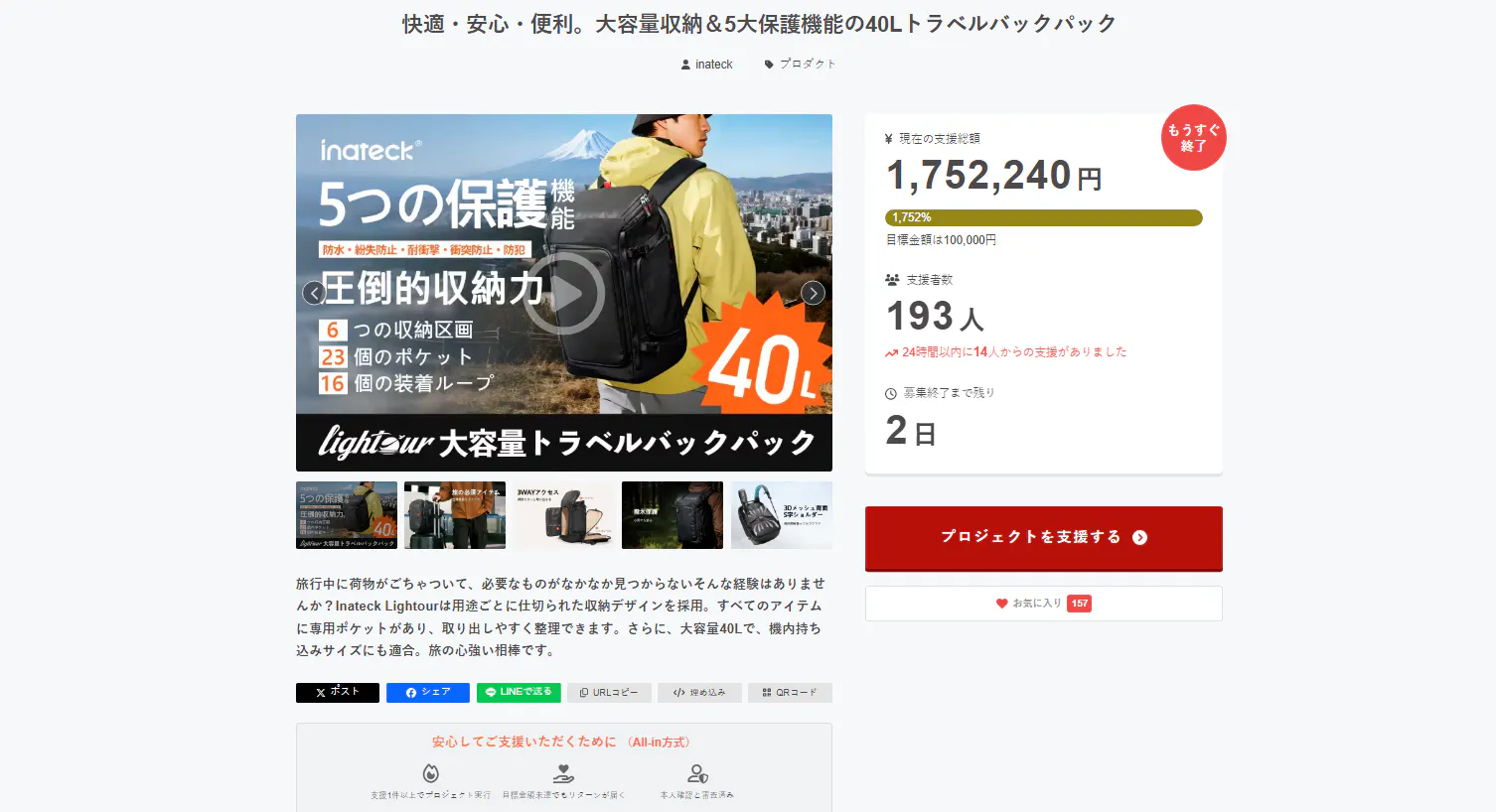 2025/11/28 15:18ご支援者の皆様、この度はInateck「Lightourバックパック」プロジェクトにご支援いただき、誠にありがとうございます。おかげさまで、目標金額を1752%超える支援をいただき、現在の支援金額は170万円を突破いたしました!心より感謝申し上げます!キャンペーン終了まで残り2日となりました。最後の時間で、より多くの方にご支援いただき、支援者数が200名を超えることを目指しています。ぜひ、ご友人やご家族にもお知らせいただき、引き続きご支援いただけますようお願い申し上げます。改めまして、この度のご支援に心より御礼申し上げます。今後ともInateckをどうぞよろしくお願いいたします! もっと見るお待たせしました!Lightour 40L バックパック、発送スタート!