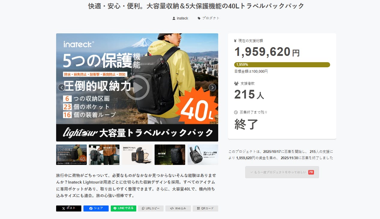 この度はInateck「Lightourバックパック」プロジェクトに多大なるご支援を賜り、誠にありがとうございました。