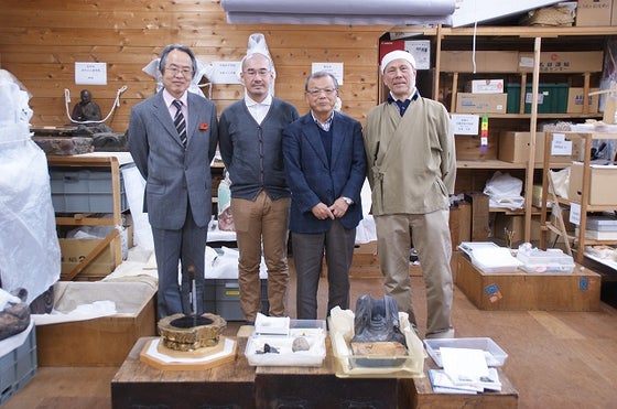 (左から田中さん、宮本、佐藤さん、牧野さん 手前に修復中の地蔵菩薩像)