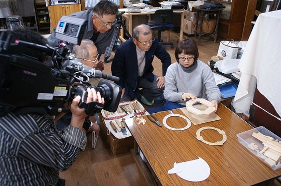 (光背を新たに作る作業を説明しており、その様子を撮影している)