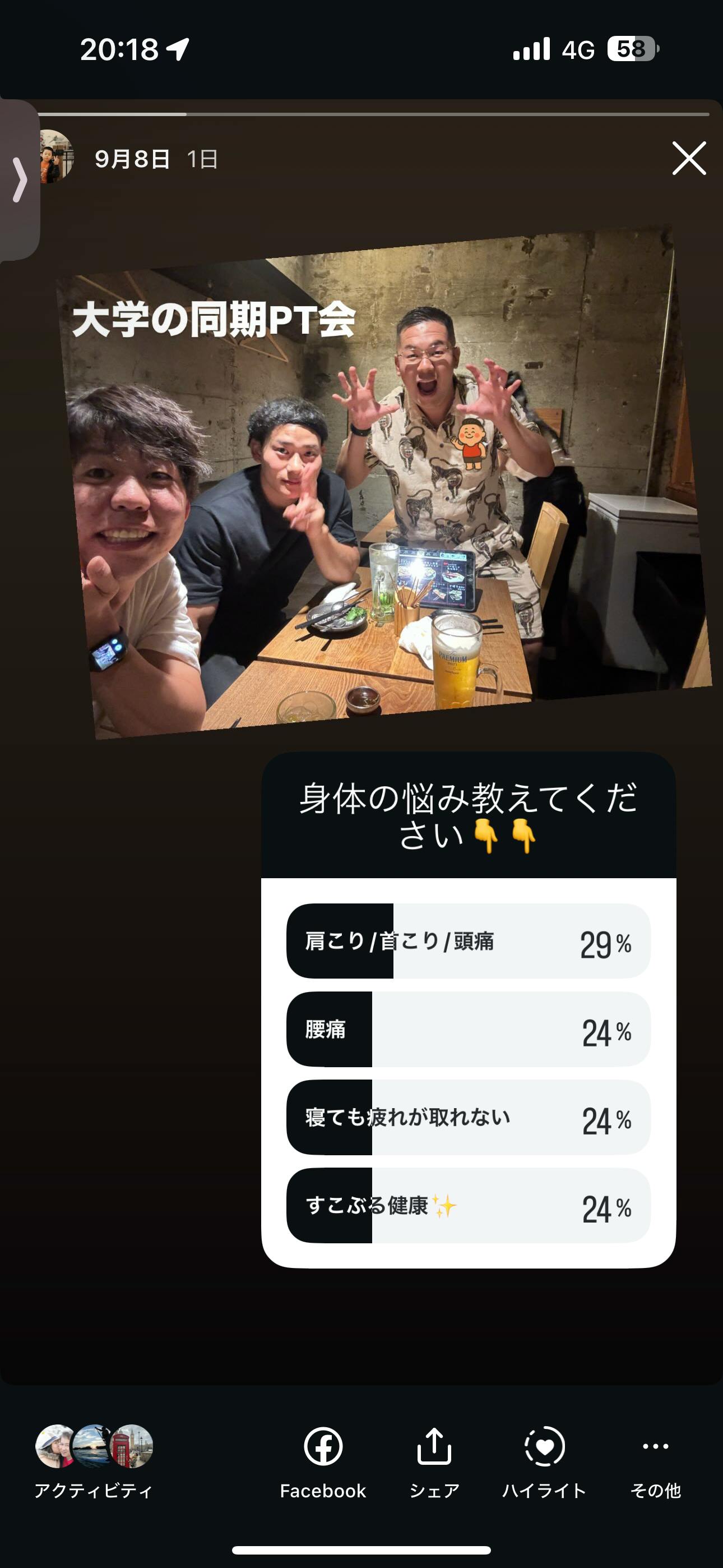 2025/09/10 21:00こんにちは♪ひろちゃんです!先日、自身のInstagramで身体の悩みアンケートを取ってみました!結果は――• 肩こり/首こり/頭痛 … 29%• 腰痛 … 24%• 寝ても疲れが取れない … 24%• すこぶる健康 … 24%僕のフォロワーが対象なので、概ね20代〜30代がメインですが、案外まばらに不調を訴える人が多いみたいですね!僅差で1位になったのが肩こり/首こり/頭痛でした。令和に生きる我々。切っても切り離せないスマホやPC。便利な反面、身体に及ぼす影響は結構ありますもんね!電車通勤してますが、僕調べでは9割の人がスマホを眺めていますね。使い過ぎは良くないですが、難しいですね。ちなみに僕は電子書籍を聴いてるので、スマホは使わないようにしてます(笑)最近流行りの「8番出口」や「夢を叶えるゾウ」なんかを聴いたりしてますね!僕のオススメは....おっと、話が逸れそうでした(笑) それでも、すこぶる健康な人も一定数いてくれて良かったです!100%の人がそう回答出来るような世界にしたいですよね!!関わる人全てにパワーやワクワクを与えられるように活動していきます!またアンケートだったり、実際のお悩みの声なども発信していければと思ってますので、乞うご期待! もっと見る