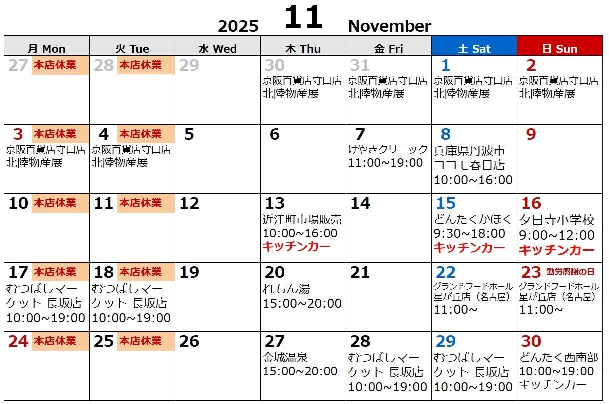 新着情報:春巻き専門店はるまき家の2025年11月の日程表が更新されました