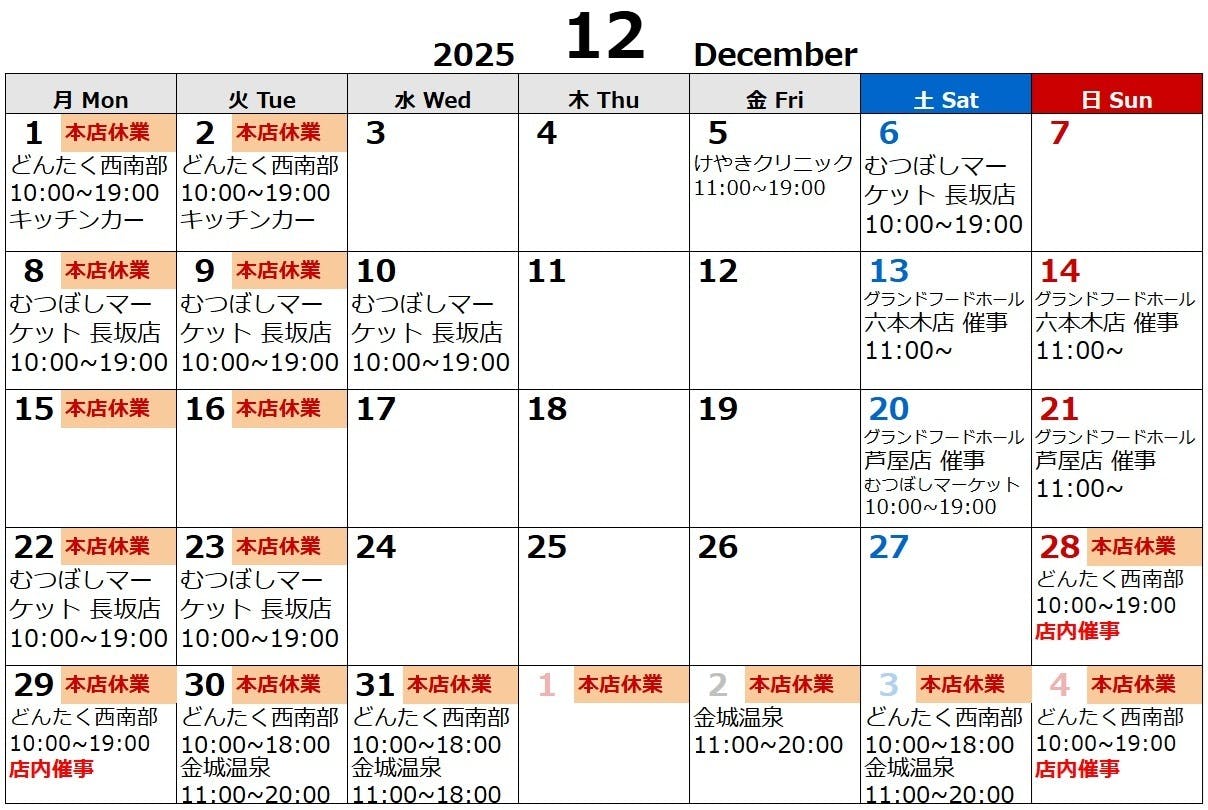 新着情報:春巻き専門店はるまき家の2025年12月の日程表が更新されました