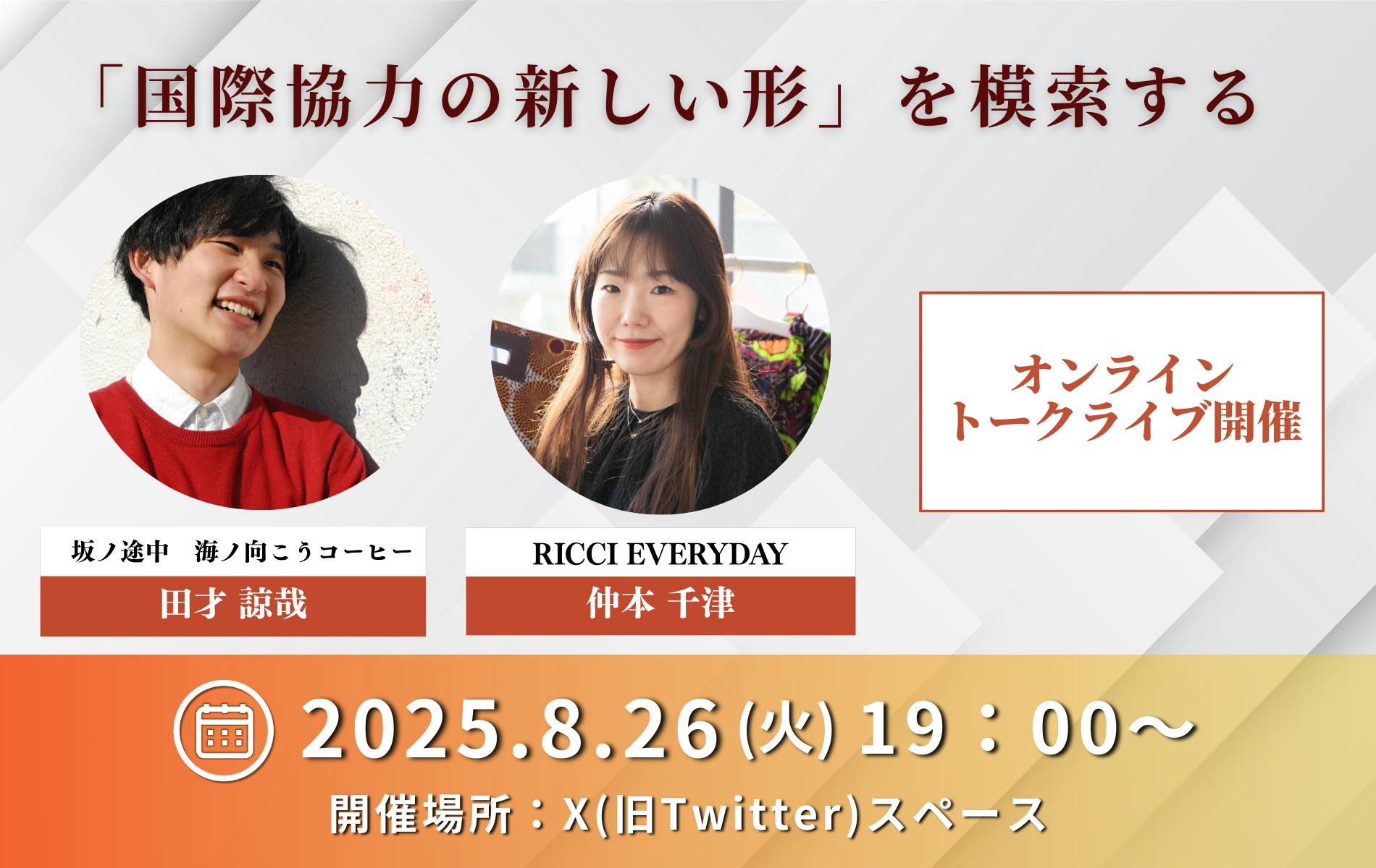 8月26日に国際協力クリエイターの田才諒哉さんと「国際協力の新しい形を模索する」というテーマでお話をさせていただきました。よろしければ、ぜひお聴きください。スペースのアーカイブはこちらからどうぞ。