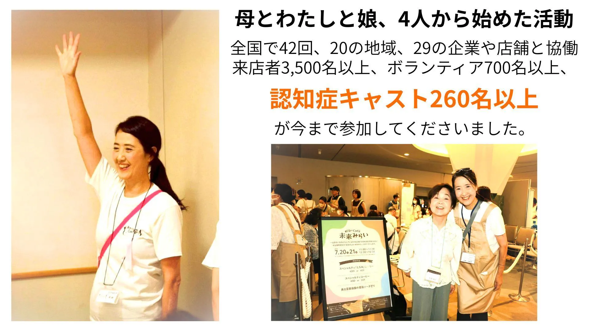 さまざまな地域とお店、企業、団体、行政などと共に認知症の方が活躍できるイベントを開催してきました。