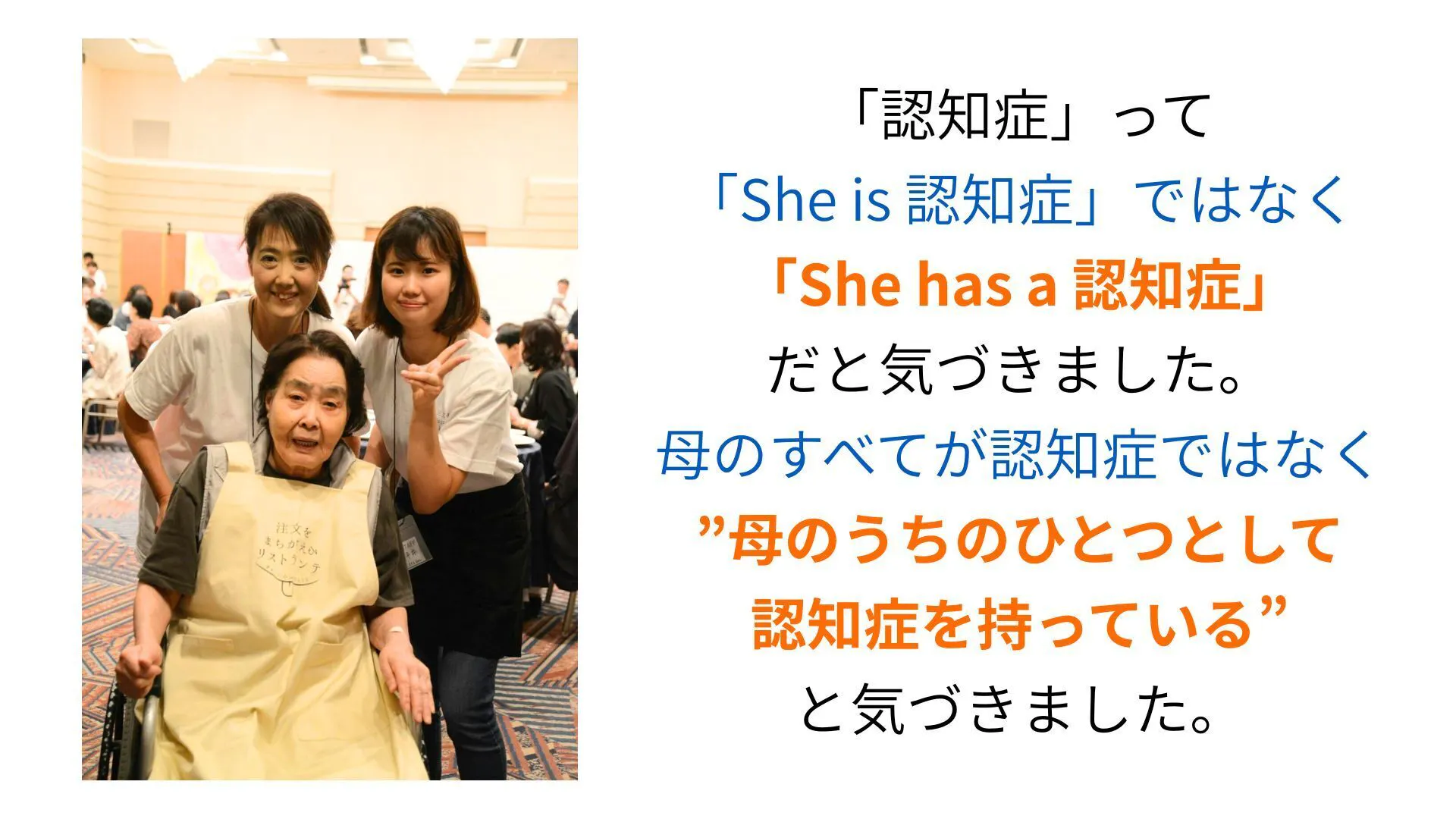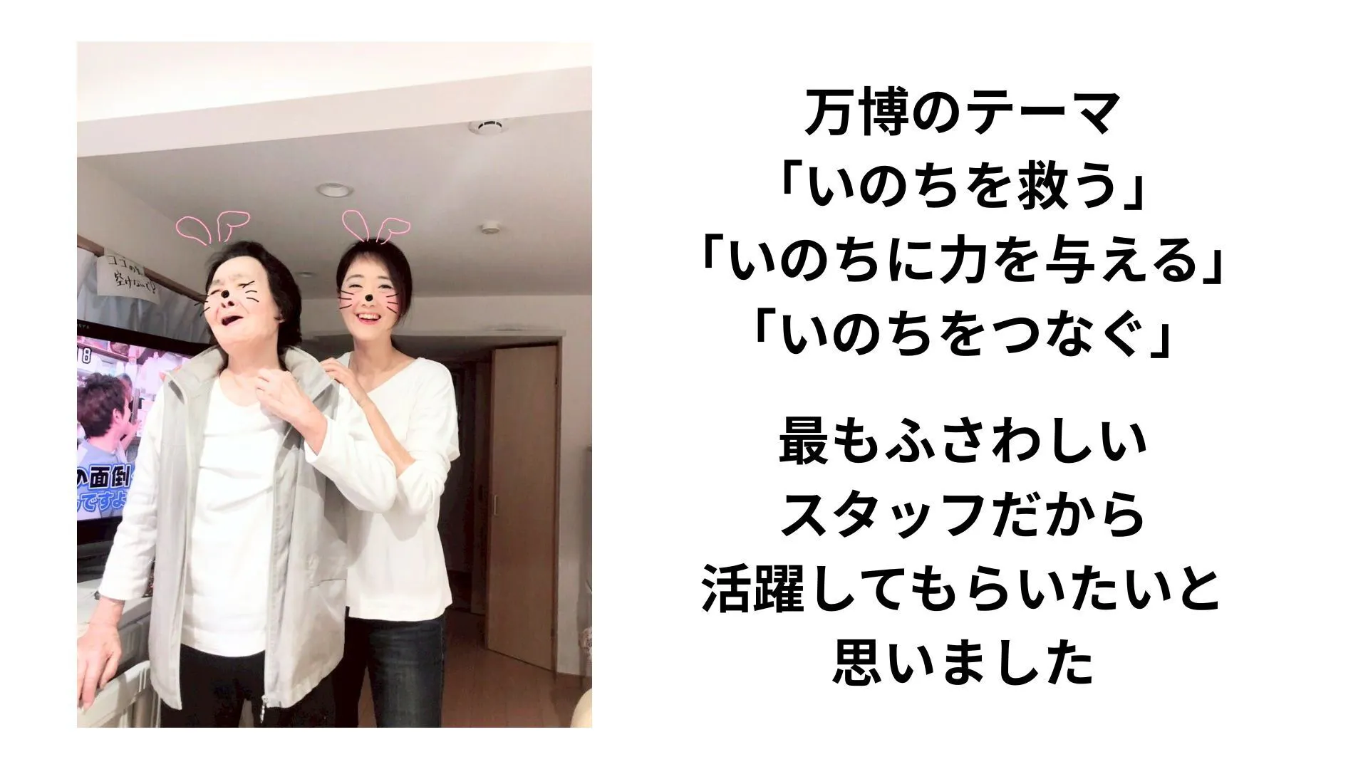 母のこの想いを、認知症の方のみならず、父や叔父が苦しんだ精神疾患や障害、また、目に見えない痛みや苦しみを抱えている方々に、家族だけで悩み抱えるのではなく、「助けて」と言える社会を、社会の側が「まあいいか」と受け止めることができる社会を、万博後も多くの方に、この活動を通して届けていきます。