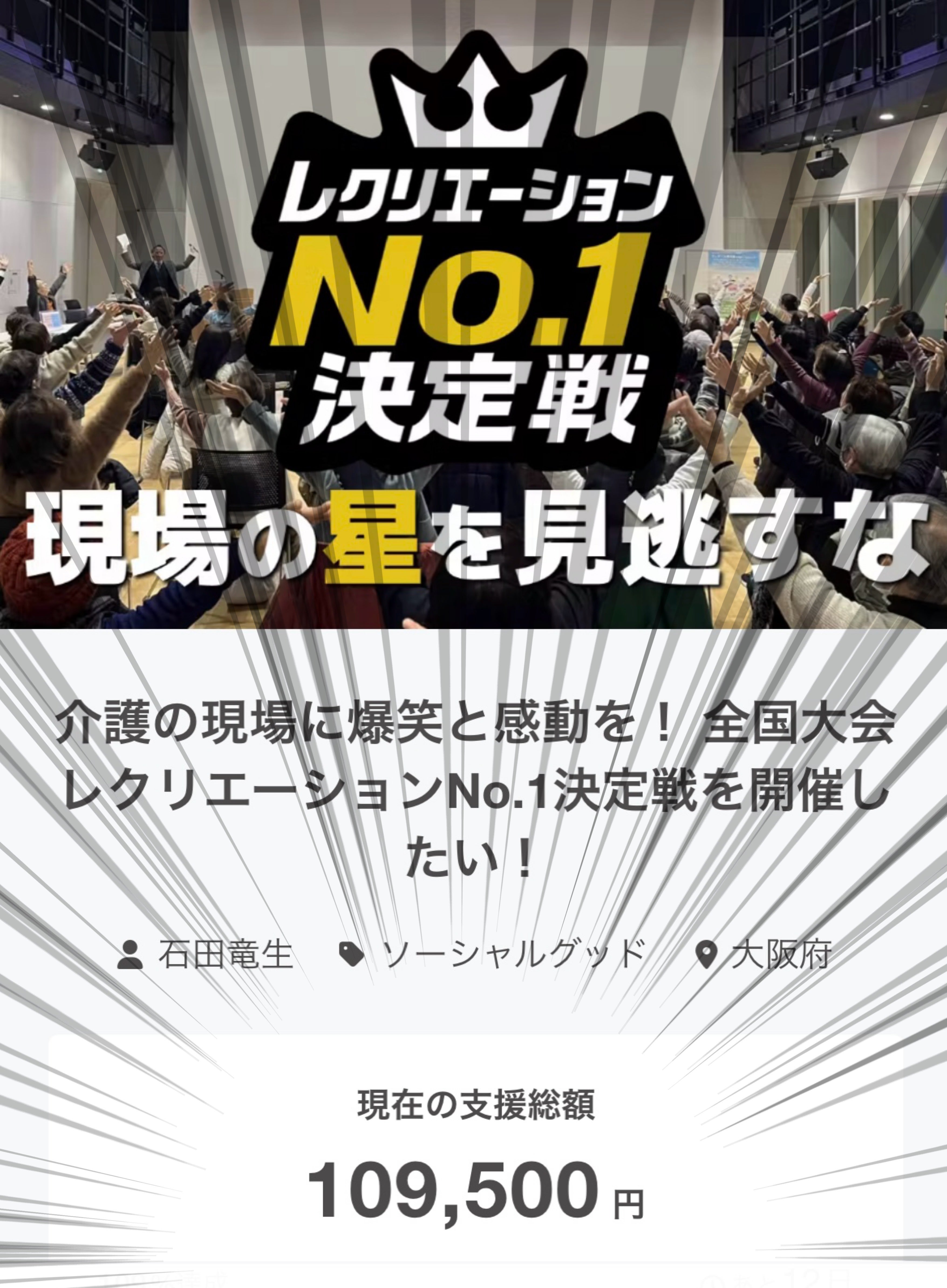 支援者の皆さまへこの度は「レクリエーションNo.1決定戦」クラウドファンディングにご支援をいただき、誠にありがとうございました。結果のご報告支援総額:158,000円(目標100,000円の158%達成)支援者数:26人募集期間:2025/07/31〜2025/08/24皆さまのおかげで、想定を超えるご支援をいただき、本大会をより充実した形で実現できることとなりました。心より感謝申し上げます。●リターンについて各リターンにつきましては、順次お届けの準備を進めております。どうぞ楽しみにお待ちください。●大会について8月30日(土)、東大阪市文化創造館にて開催する「レクリエーションNo.1決定戦」は、全国から集まった出場者たちが「とにかくおもしろいレクリエーション」で競い合う、初の試みとなるイベントです。ご支援いただいた皆さまに見守られながら、必ず成功へと導いてまいります。当日お越しいただける方とは、会場で直接お会いできることを楽しみにしています。改めまして、温かなご支援と応援を本当にありがとうございました。これからも「介護現場に笑いと元気を!」の思いを胸に、挑戦を続けてまいります。主催者介護エンターテイナー 石田竜生