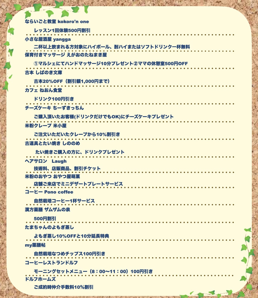 いささんちマルシェの仲間や地域のお店めぐりに使えるお得な優待券です。